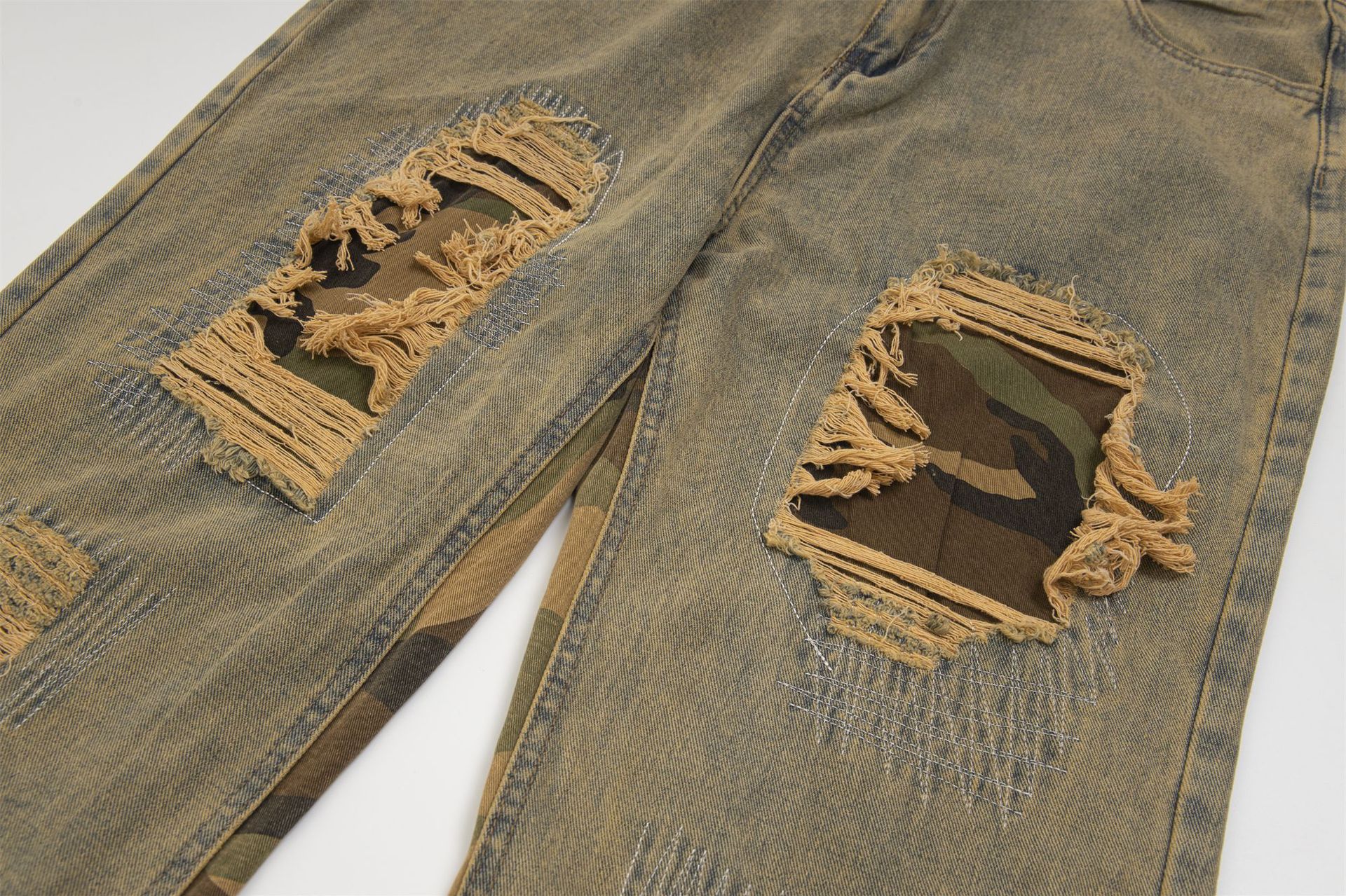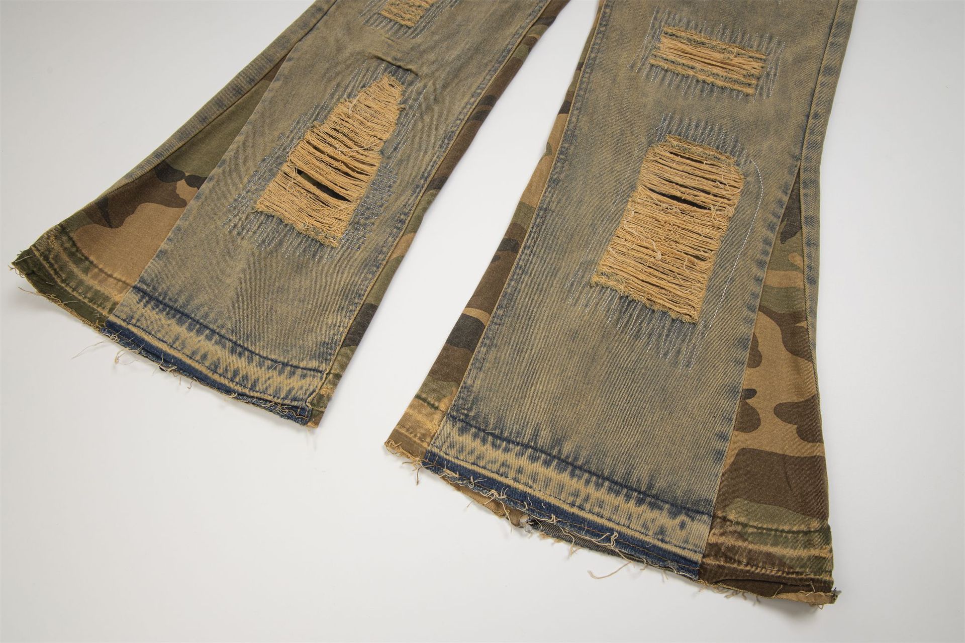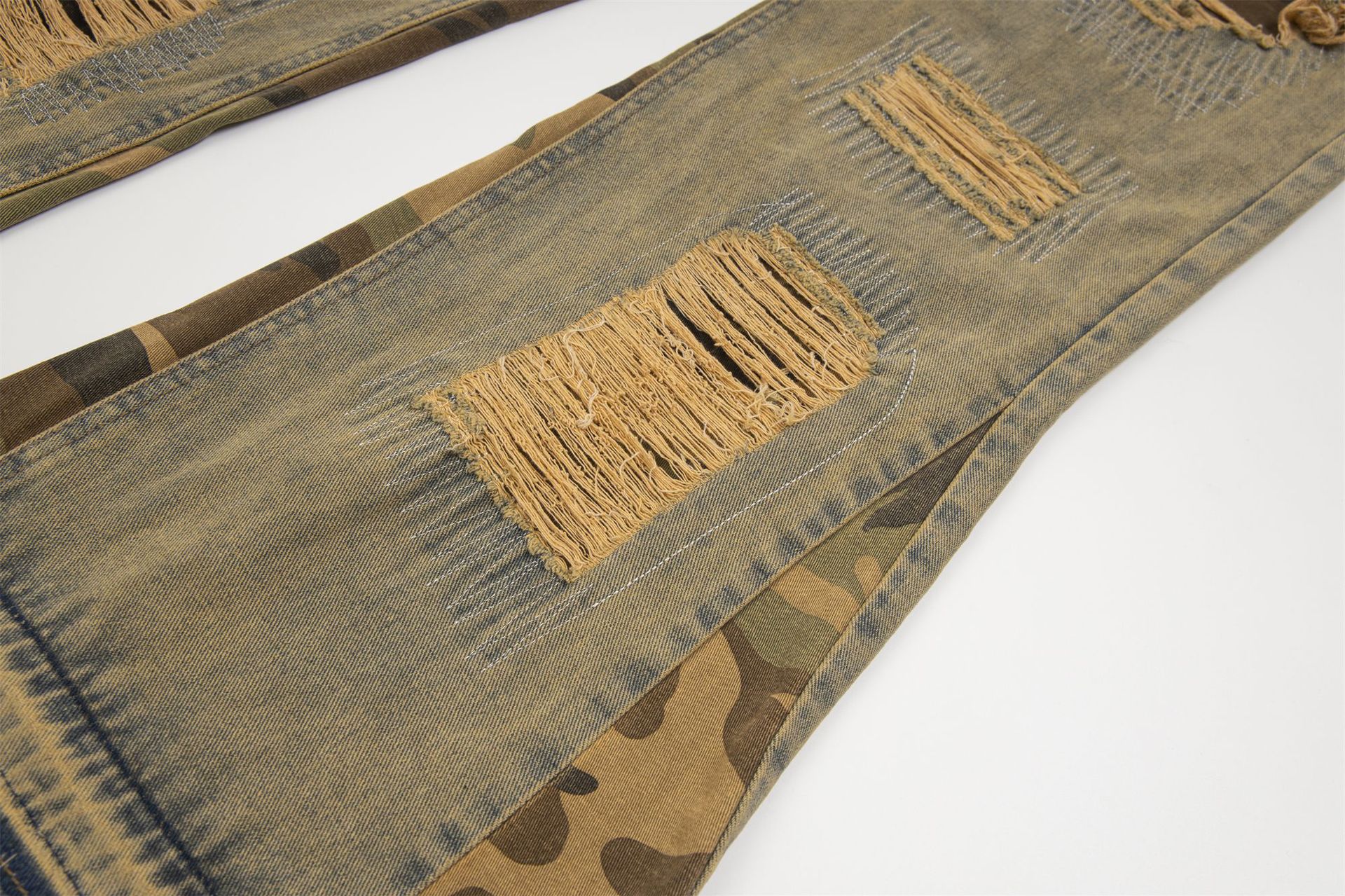 Camouflage Stitching Distressed Raw Hem Jeans Men