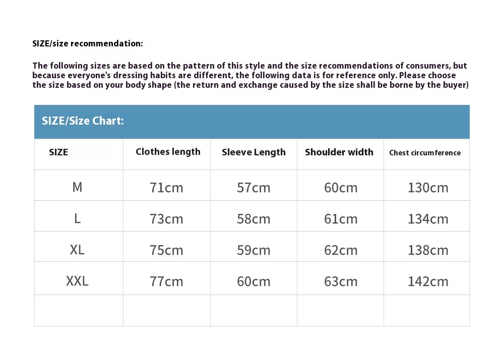 1. Asian sizes are 1 to 2 sizes smaller than European and American people. Choose the larger size if your size between two sizes. Please allow 2-3cm differences due to manual measurement. 2. Please check the size chart carefully before you buy the item, if you don't know how to choose size, please contact our customer service. 3.As you know, the different computers display colors differently, the color of the actual item may vary slightly from the following images.