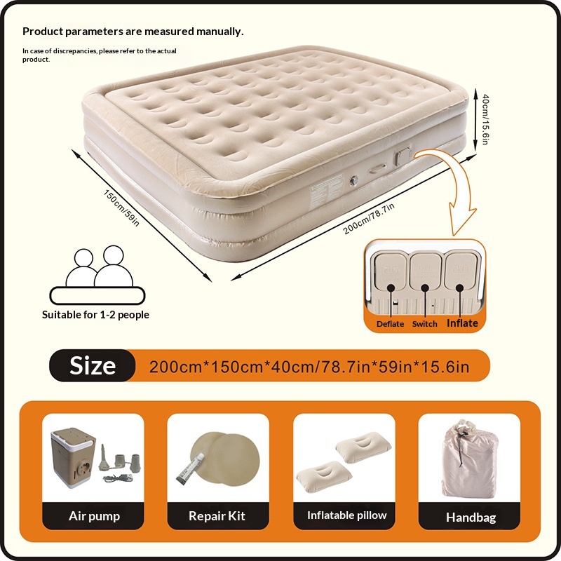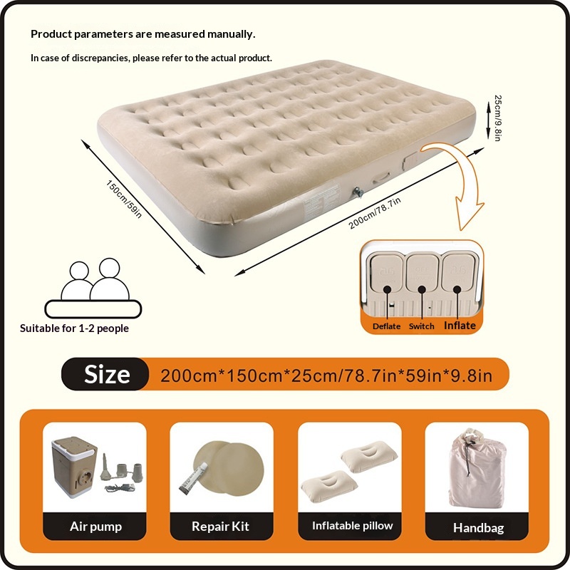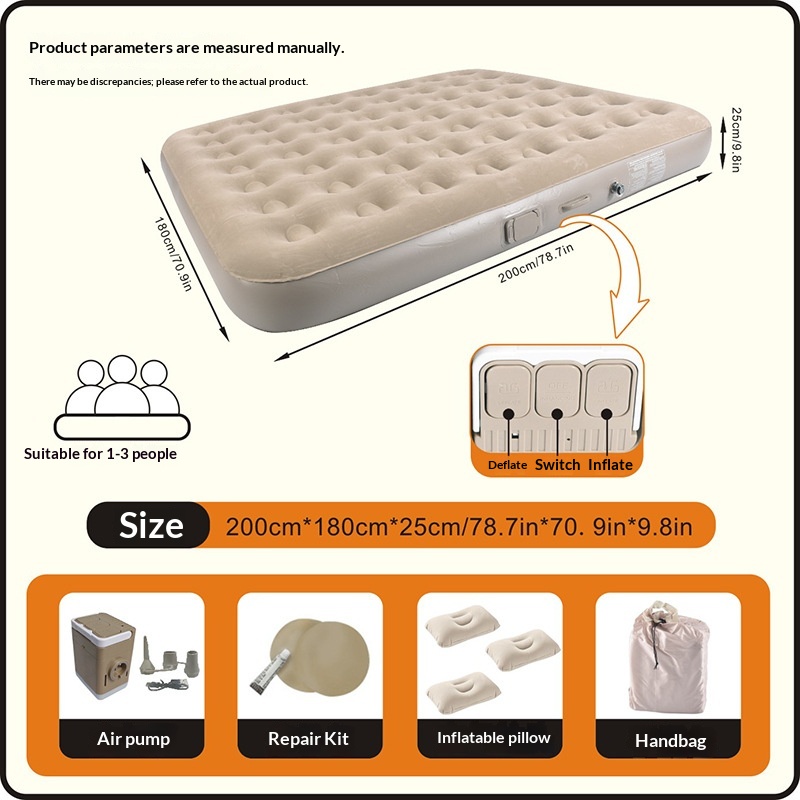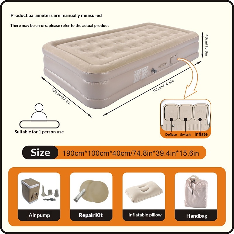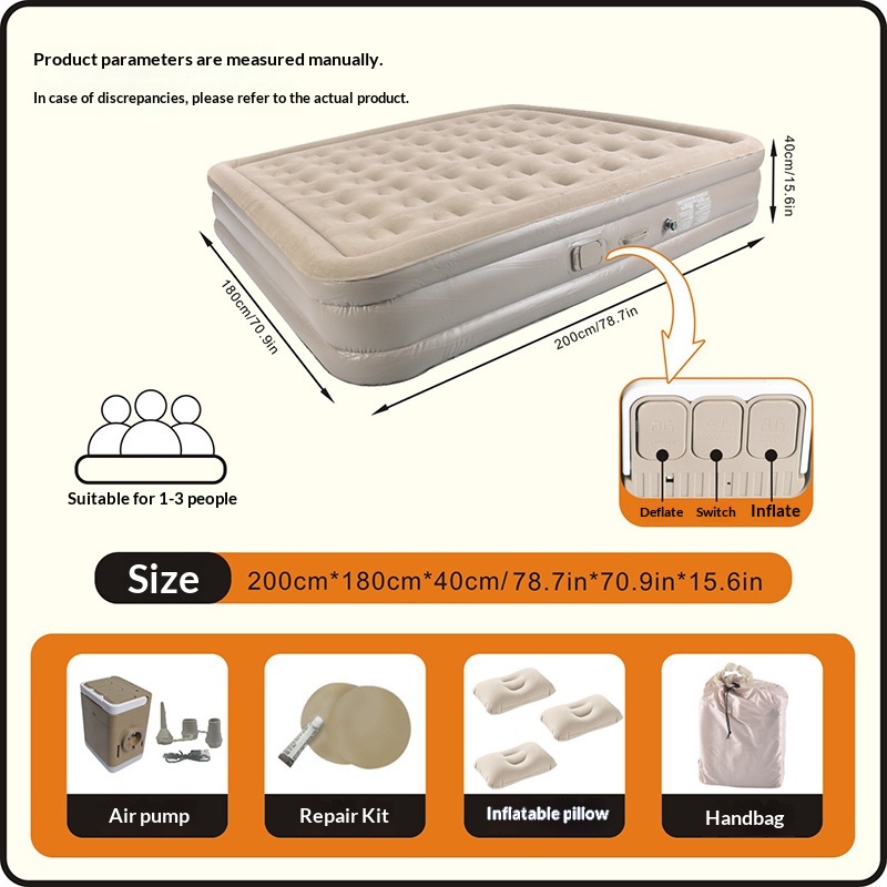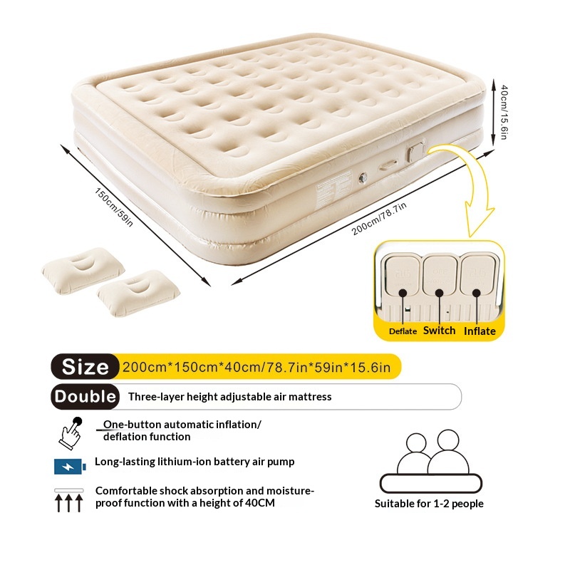 Colors: Single low-inflatable bed 190 x 100 x 25 cm, Double low-inflatable bed 200 x 150 x 25 cm, Triple low-inflatable bed 200 x 180 x 25 cm, Single high-inflatable bed 190 x 100 x 40 cm, Double high-inflatable bed 200 x 150 x 40 cm, Triple high-inflatable bed 200 x 180 x 40 cm