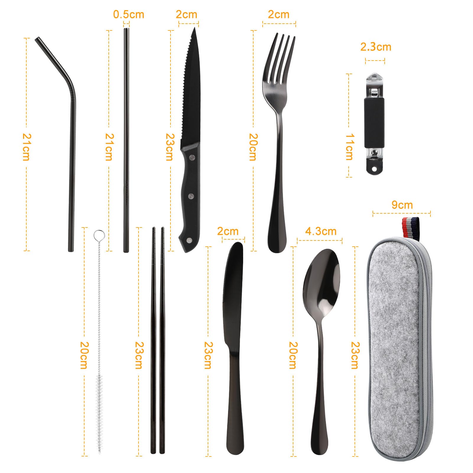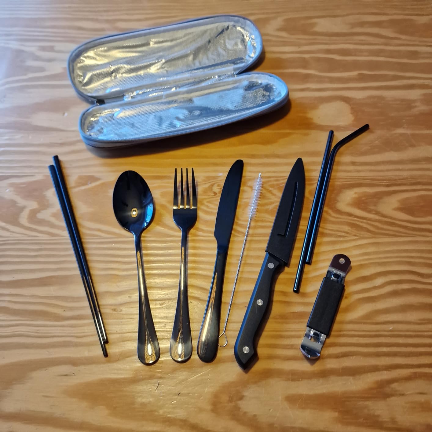 【Camping Cutlery Set】Includes 1 pair of chopsticks, 1 fork, 1 spoon, 1 steak knife, 1 bread knife, 1 bottle opener, 1 straight straw, 1 bent straw, and 1 straw cleaning brush.