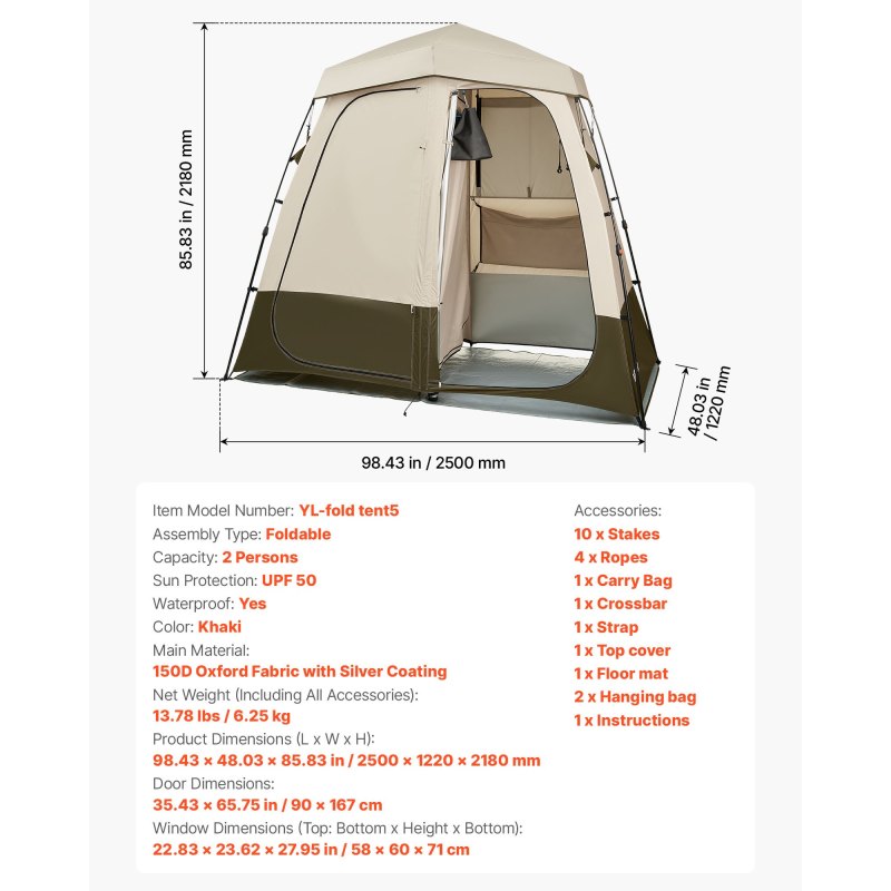 Sun Protection & Water Resistance: Made of 150D Oxford fabric with UPF 50 protection, our privacy tent blocks harsh sunlight. Side windows improve airflow. PU2000mm water resistance lets rain slide off quickly, keeping the interior dry