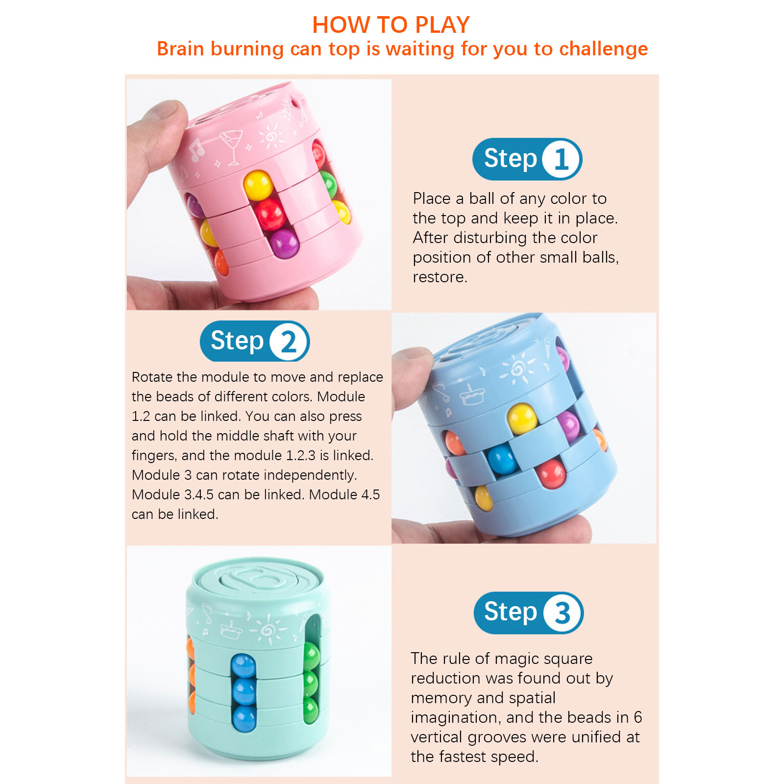 Turn the module to move and replace beads of different colors. Module 1.2 can be linked. You can also press the middle axis with your fingers, and module 1.2.3 will be linked together. Module 3 can be rotated independently. Module 3.4.5 can be linked. Module 4.5 can be linked.