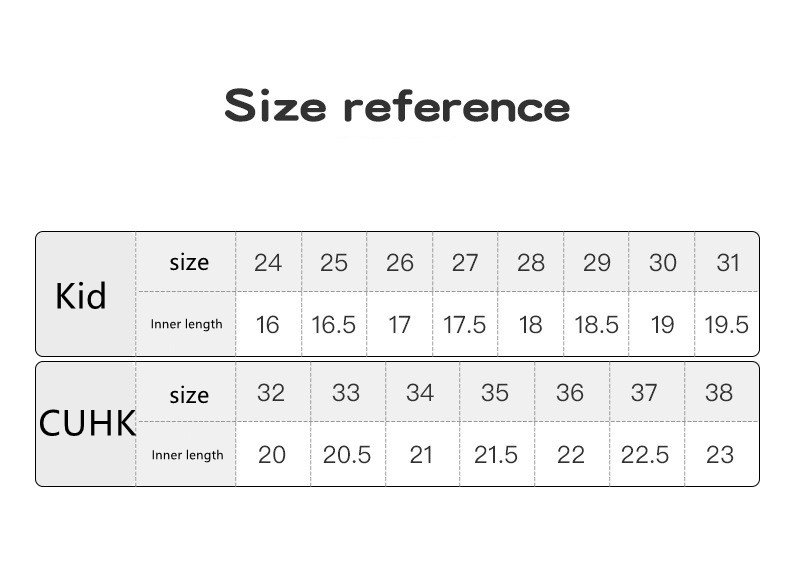 Size: 24 inner length 16/suitable foot length 15.5, 25 inner length 16.5/suitable foot length 16,26 inner length 17/suitable foot length 16.5, 27 inner length 17.5/suitable foot length 17, 28 inner length 18/suitable foot length 17.5,29 inner length 18.5/suitable foot length 18,30 inner length 19/suitable foot length 18.5,31 inner length 19.5/suitable foot length 19,32 inner length 20/suitable foot length 19.5,33 inner length 20.5/suitable foot length 20,34 inner length 21/suitable foot length 20.5, 35 inner length 21.5/suitable foot length 21,36 inner length 22/suitable foot length 21.5, 37 inner length 22.5/suitable foot length 22,38 inner length 23/suitable foot length 22.5