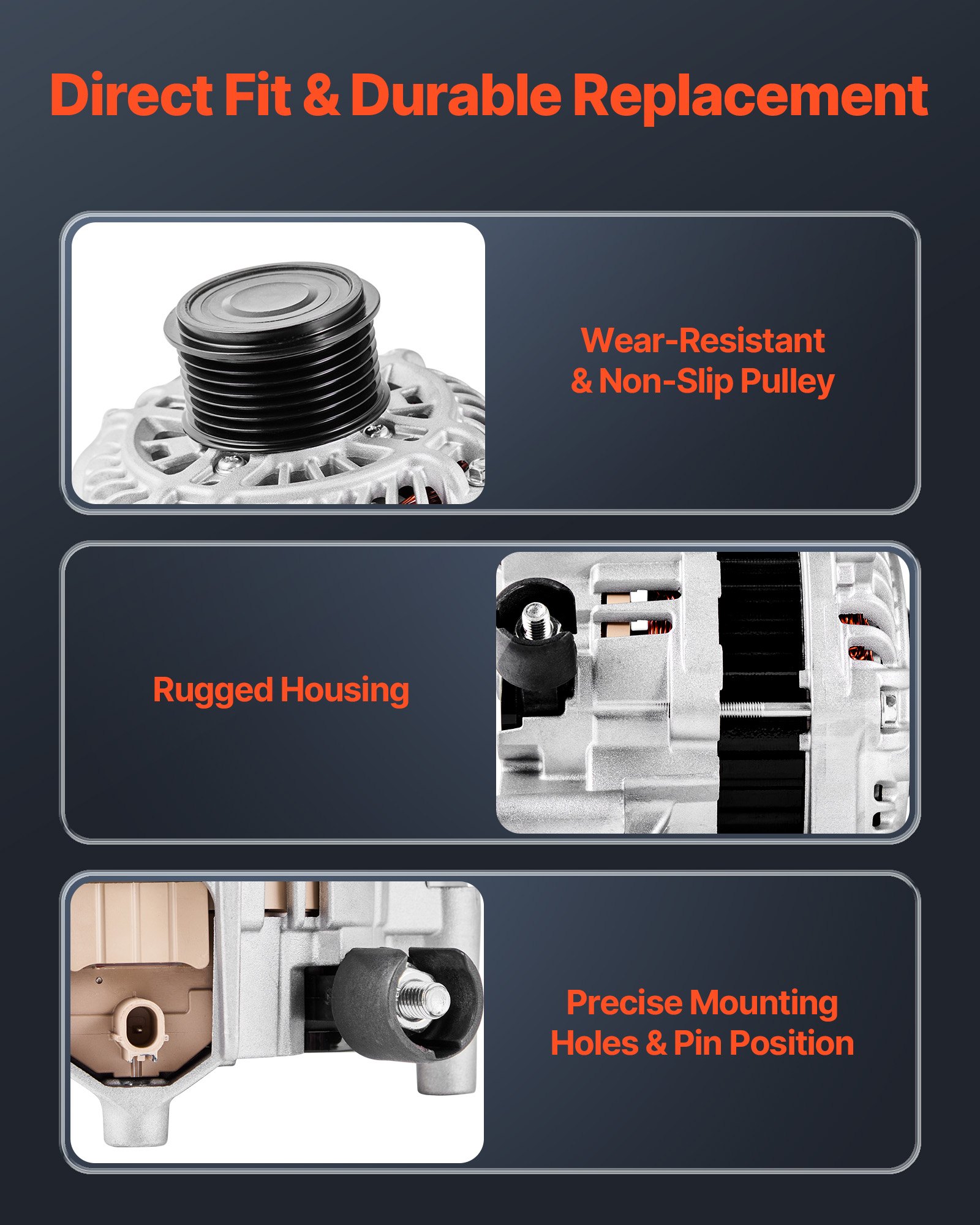 Durable Materials: Our automotive replacement alternator is built with high-temp-resistant copper coils and a lightweight aluminum housing with cooling fan. This combo improves heat dissipation and conductivity while withstanding tough conditions