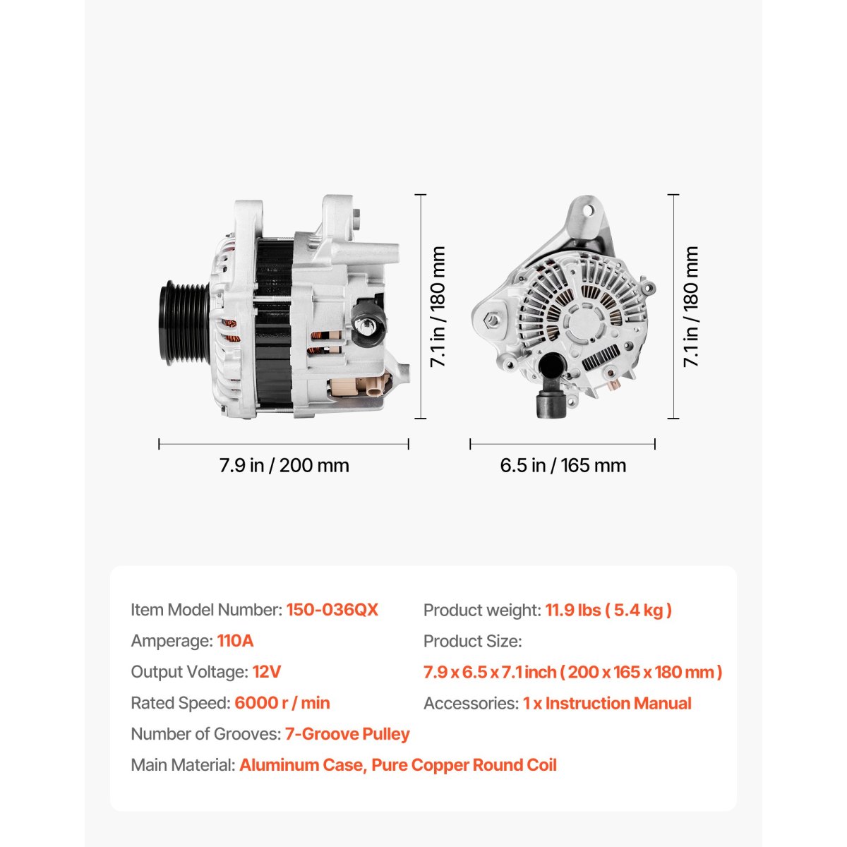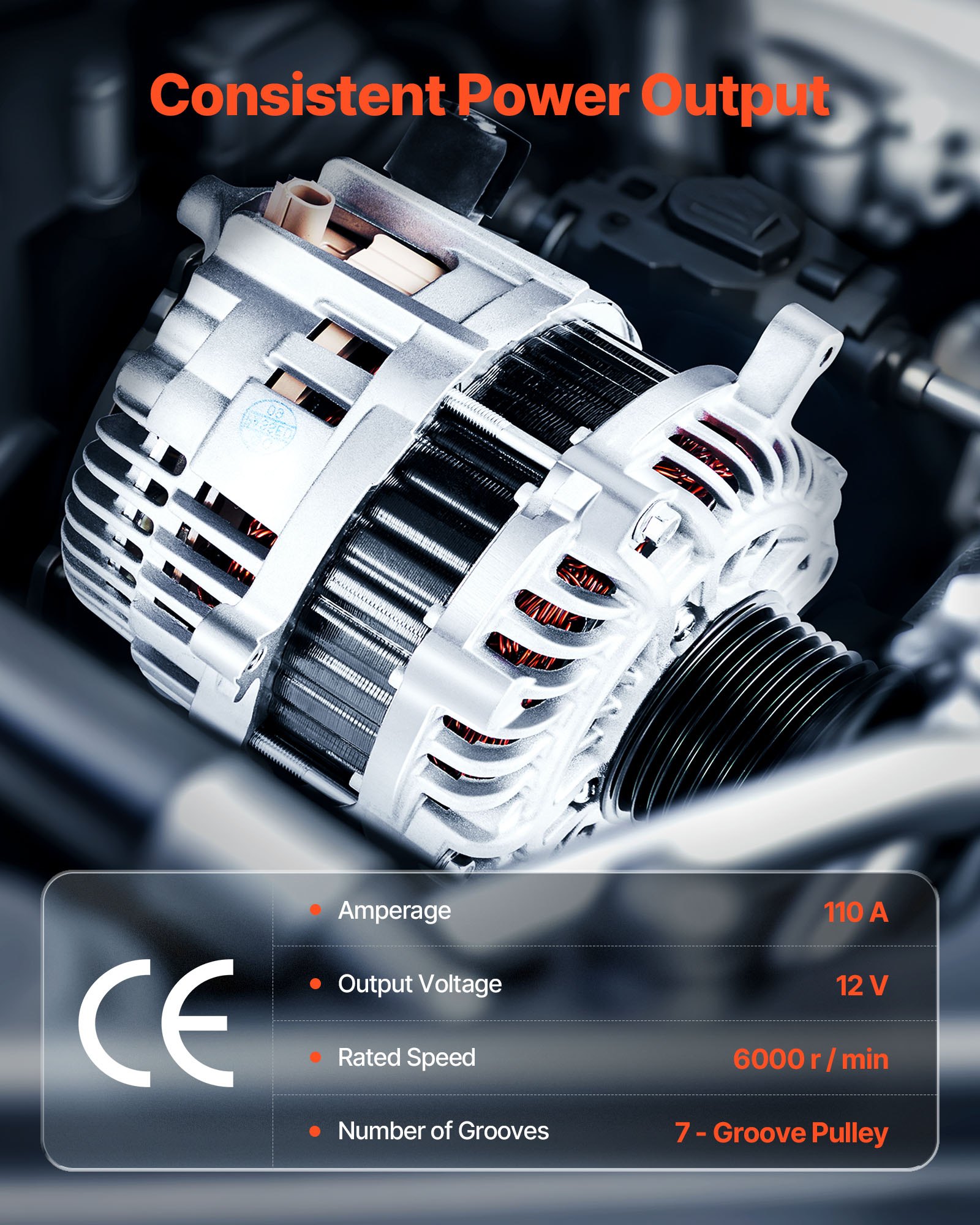 Stable Performance: This alternator replacement delivers efficient 12V DC output to power your vehicle's systems. The 7-groove pulley ensures a steady, non-slip drive up to 6000 RPM—keeping ignition, lighting, and infotainment running smoothly