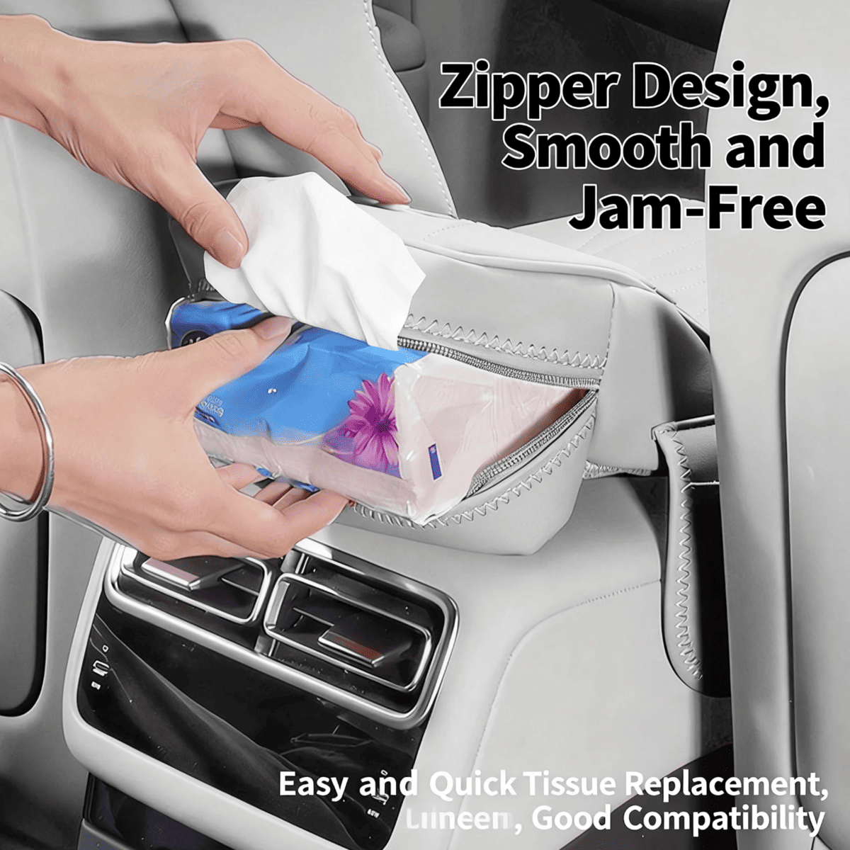 2. MULTIFUNCTIONAL 3-IN-1 DESIGN: Features built-in tissue box with smooth zipper for easy refills, dual side storage pockets for phones and cards, and integrated cup holder compatibility to maximize your center console utility