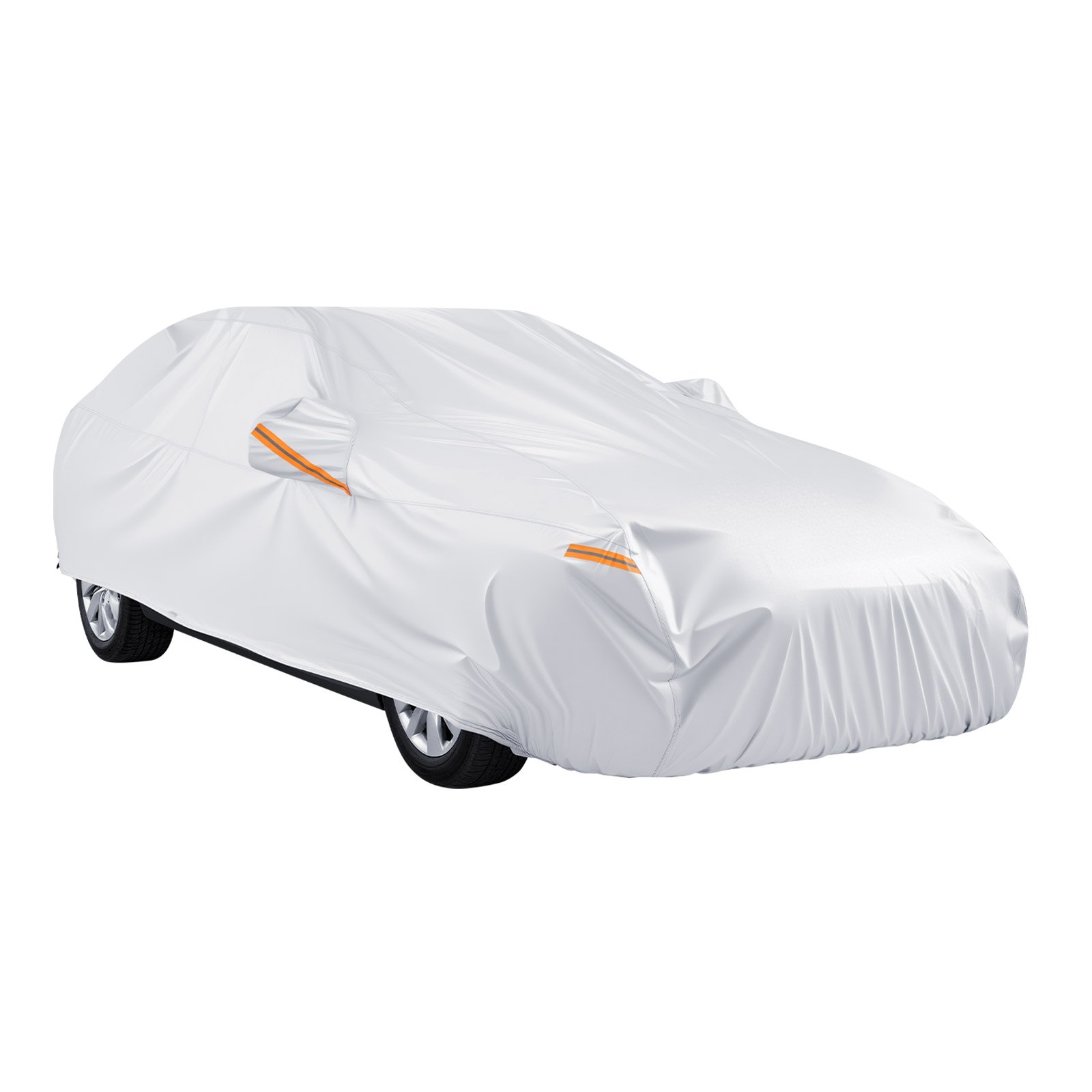 Features & Details Tailored for Large Sedans: Our full exterior cover is designed for full size European sedan cars, including the BMW 5 Series, BMW 6 Series, BMW 7 Series, Mercedes-Benz E-Class, Mercedes-Benz S-Class, Audi A6 & A6L, Audi A7, and Audi A8L. Not compatible with vehicles having retractable or whip antennas or high protruding features. A storage bag is included for easy folding and storage in your trunk Weather-Ready Durability: Constructed with quality PEVA aluminum cotton, this car cover can withstand 2000mm of water pressure, offering waterproof, heat-resistant, and quick-drying performance. The double-stitched seams enhance tear resistance, while the cotton inner lining ensures the safety of your car's paint. An ideal all-weather solution for your vehicle Easy Access & Visibility: Equipped with a left-side zipper, this car cover waterproof allowing for easy access to your car without needing to remove it entirely. The cover also features reflective strips on both sides and four additional strips on the front and rear, enhancing visibility and safety during nighttime Full Wind Resistance: This custom fit car cover is designed with elastic hems on the front and rear for a perfect fit, offering complete wind protection. Three windproof straps with buckles keep the cover tightly in place, ensuring it won't be blown away during strong winds or typhoon-like conditions. Ideal for all-weather, secure coverage Complete Element Shield: Offering year-round protection, this full car cover features a waterproof outer layer that resists heavy water pressure, perfect for wet weather. Its high-reflective silver lining blocks harmful rays to keep your car safe from sun damage. Shield your vehicle from rain, frost, leaves, sand, dirt, and more, no matter the season