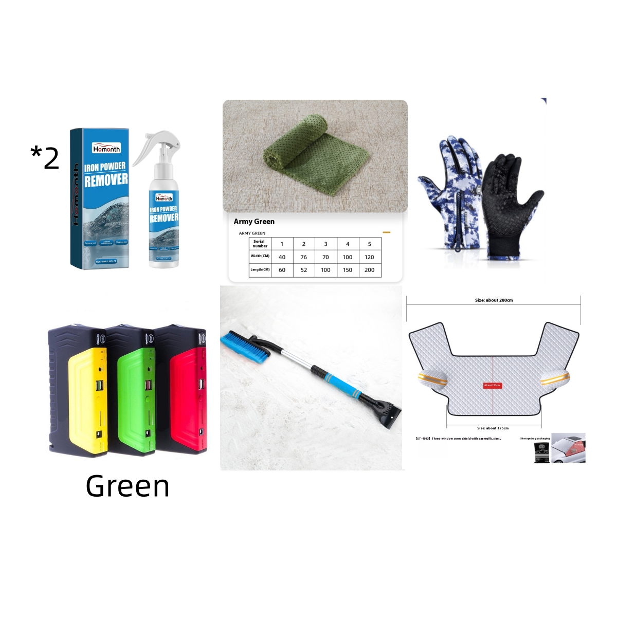 Sunshade cover * 1+Defrost shovel x1+mergency supply*1+Gloves x1 pair+Pet Blanket X 1+Spray *2