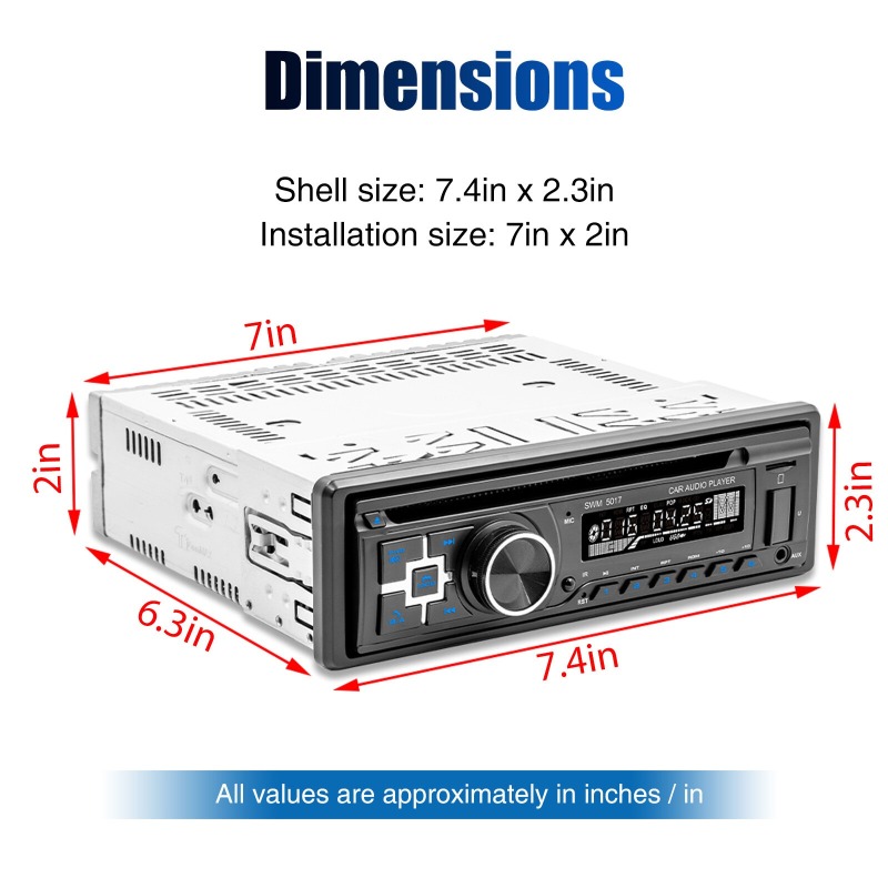 1 Din CD Car Stereo DVD Player--This single din car stereo comes with 4 inch LCD display screen. Fit for single din size, install size: 178*161*50mm/ 7.0*6.34*1.97 inch(L,D,H). The panel size: 188*161*58mm/7.40*6.34*2.28inch(L,D,H) Including wireless remote control (full-featured digital remote control operation).