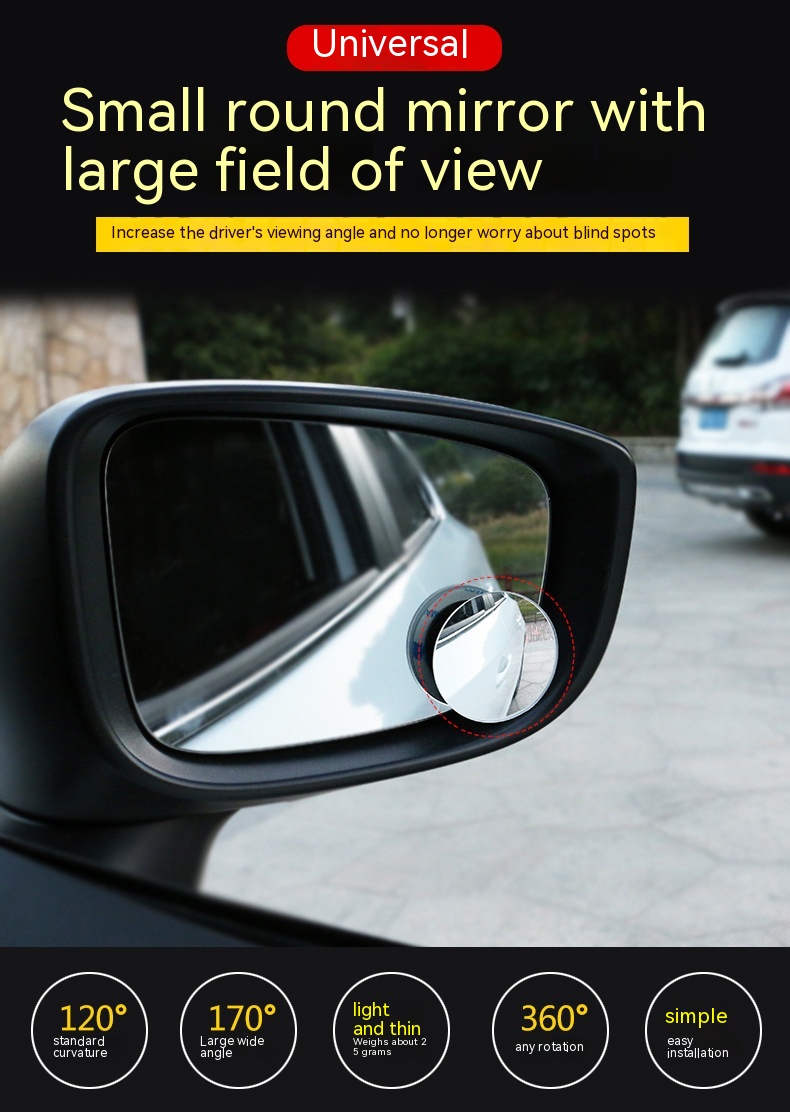 360 ° adjustable angle, 360 degree adjustable angle fan mirror, spherical convex blind spot removal small fan mirror, attached to the reflector, can effectively eliminate blind spots and expand the field of view. Stereoscopic wide-angle mirrors can eliminate blind spots in the field of view, and the 49mm large mirror effectively expands the field of view; Install the product appropriately on the side of the driving position and on the rearview mirror.