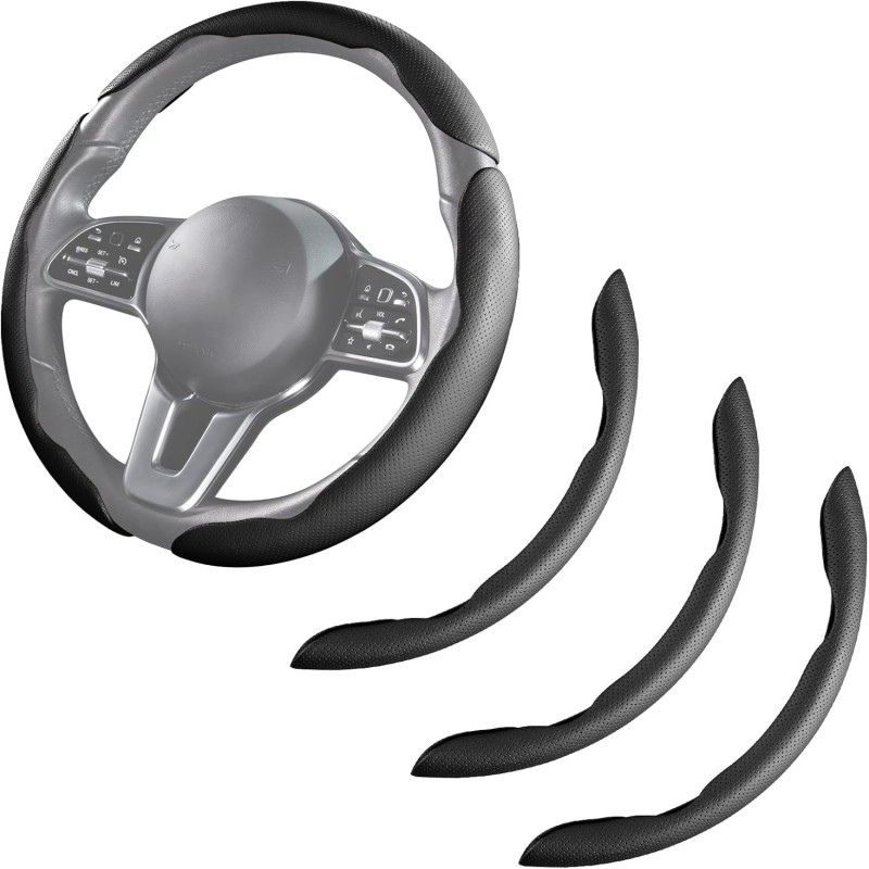 Car Steering Wheel Cover - Leather Snap-on Three-piece Set - Anti-slip Protection Cover - Steering Wheel Control Accessory - Universal Model - Black And Gray