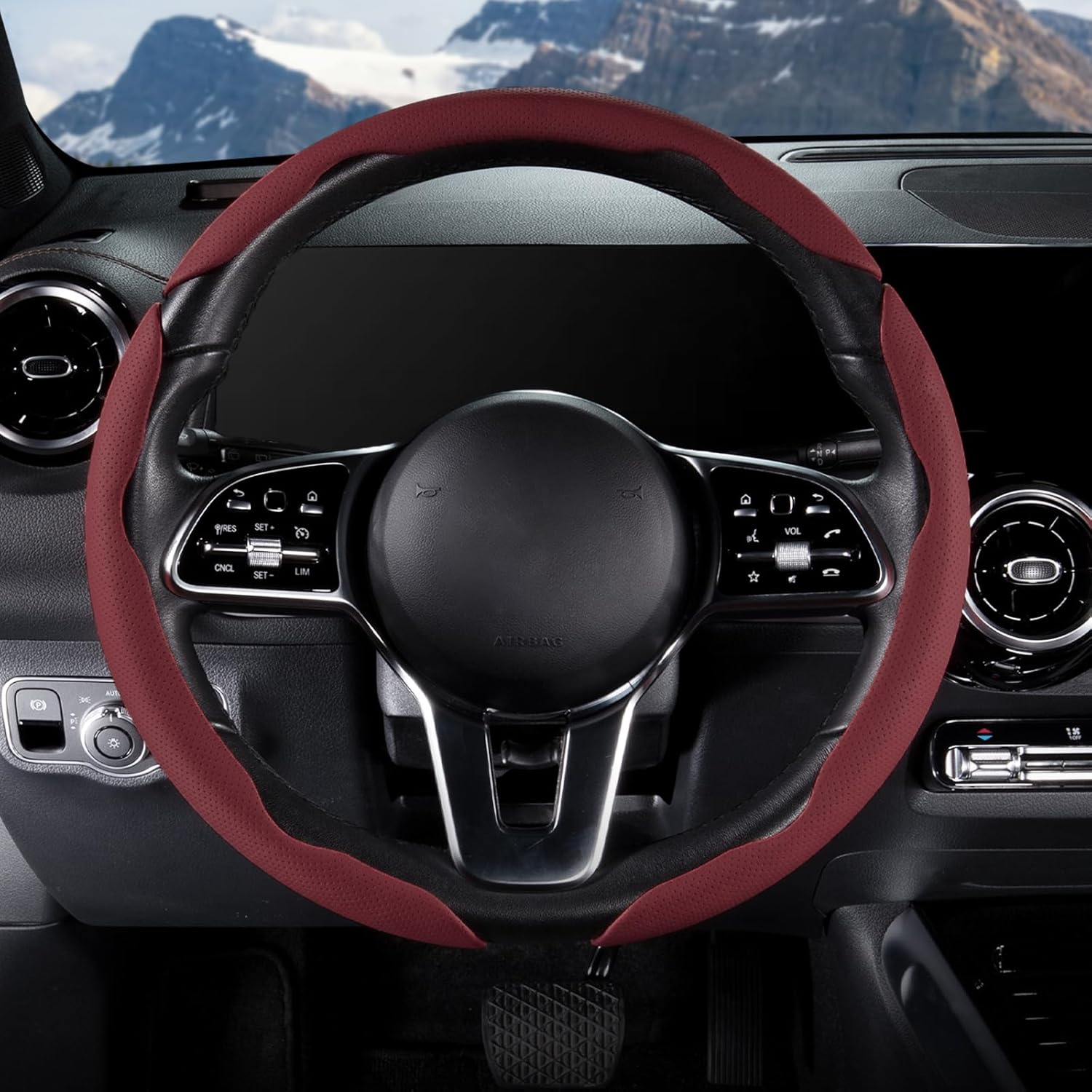 Car Steering Wheel Cover - Leather Snap-on Three-piece Set - Anti-slip Protection Cover - Steering Wheel Control Accessory - Universal Model - Red Wine Color