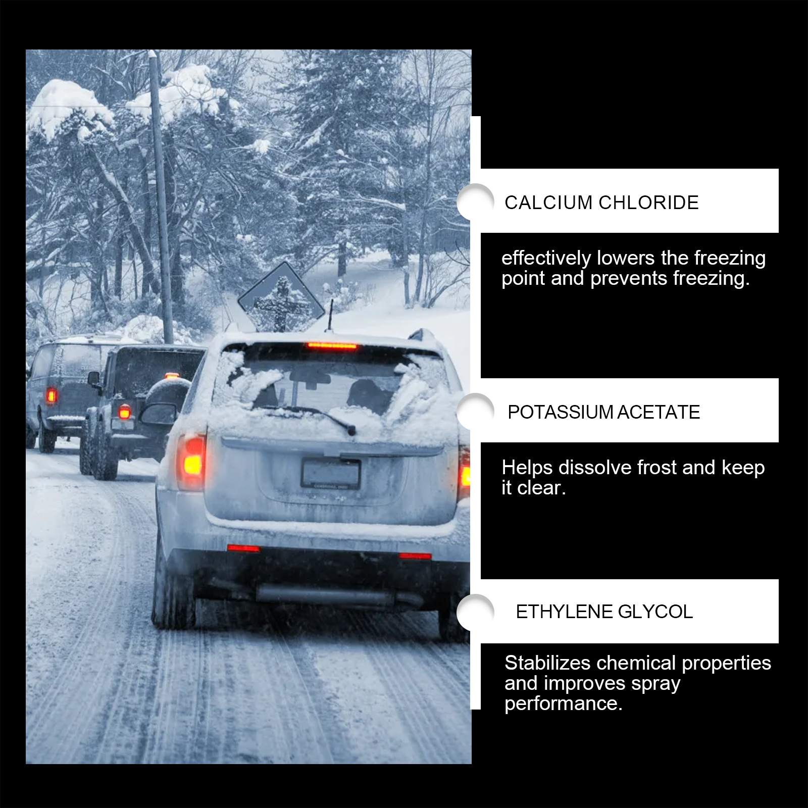 Product ingredients: water, calcium chloride, potassium acetate, ethylene glycol