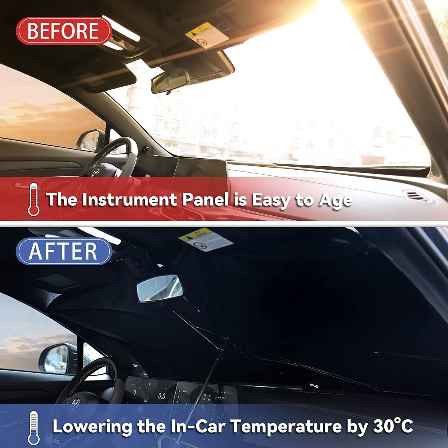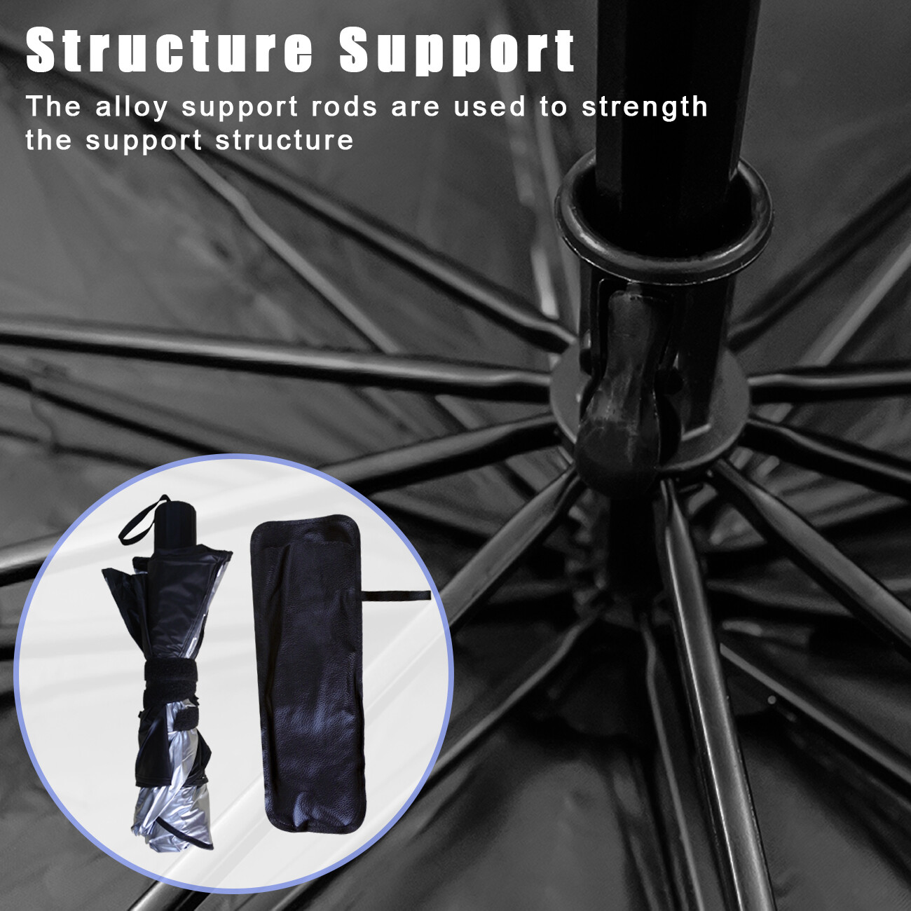 【High Quality Materials】: Car windshield sun shade umbrella is made of high density cloth,with titanium silver coating and 10 bones Skeletons.which is strong, durable, and corrosion-resistant, The cloth are not easily damaged under high temperature, and will not emit odors.Car sun shade windshield is light in weight, the material is not rusty, the umbrella bone has good toughness. You can use it every summer.