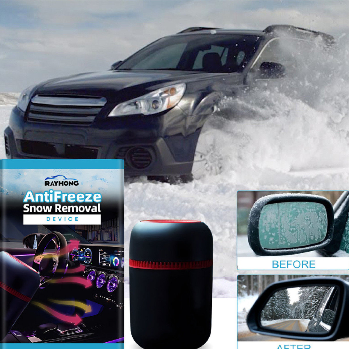 Usage: 1. Open the lid and remove the black inner cover; 2. Put the lid back to its original place and put it in a safe and stable place in the car; 3. The released energy substance can melt ice and snow.