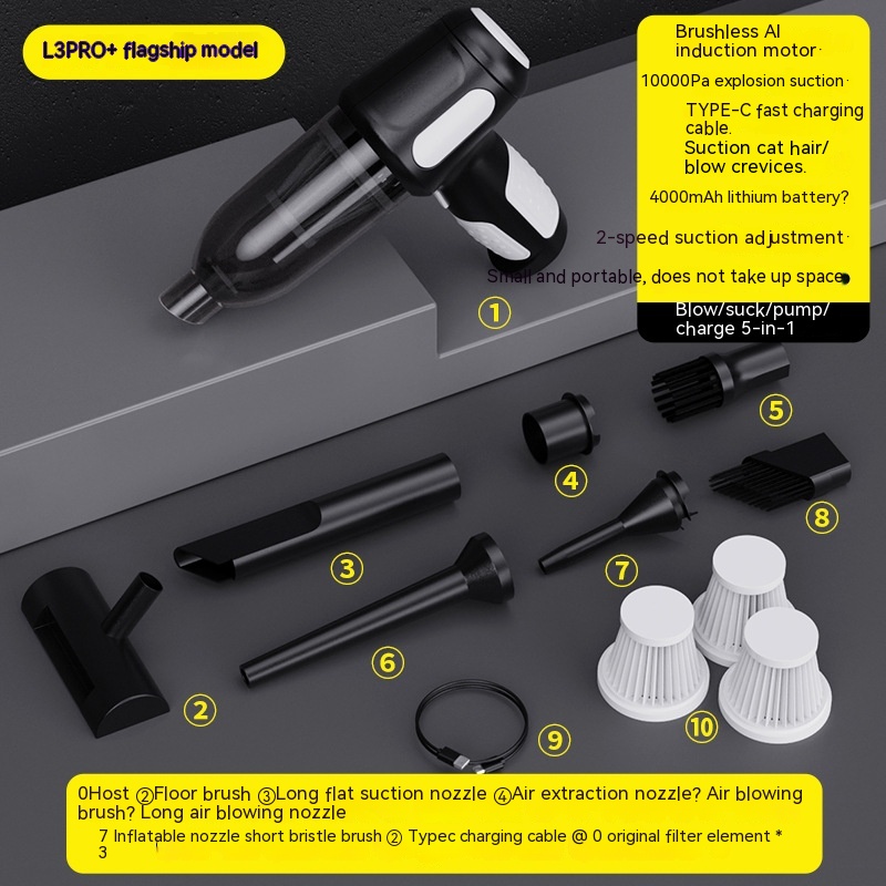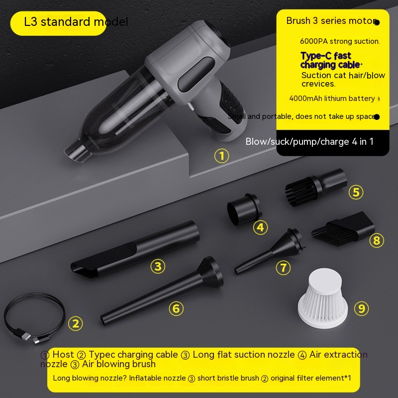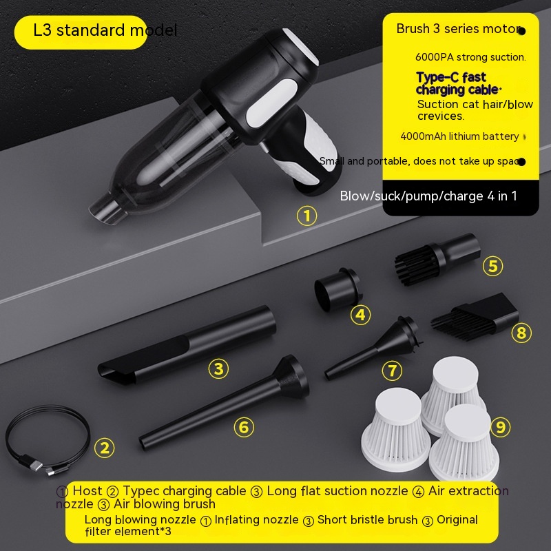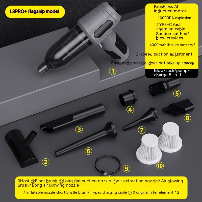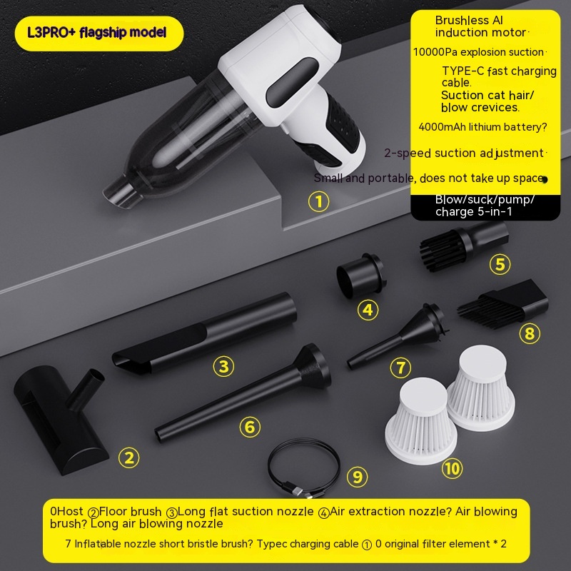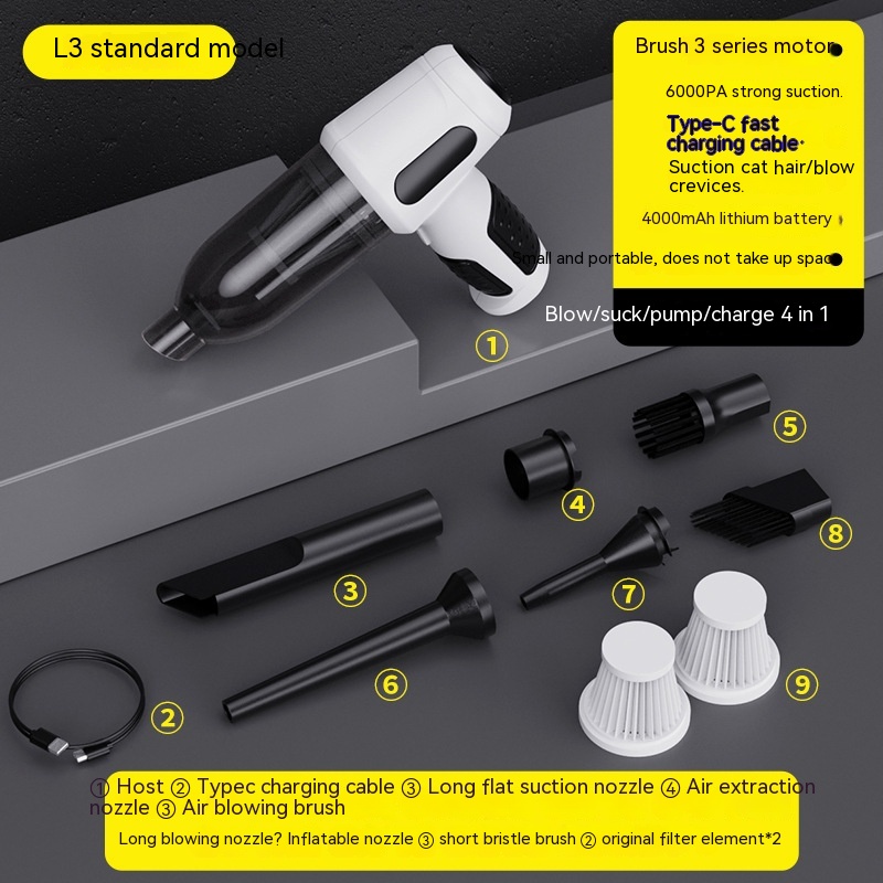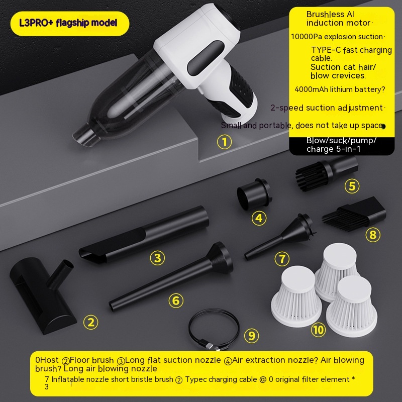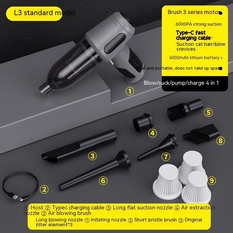 Color classification: [standard black] 6KPa strong suction-4 in 1 blowing suction charge-Type-C fast charging port-4000mAh lithium battery, [Standard White] 6KPa strong suction-4-in-1 blowing suction charge-Type-C fast charging port-4000mAh lithium battery, [Standard Gray] 6KPa strong suction-4 in 1 blowing suction charge-Type-C fast charging port-4000mAh lithium battery, [Flagship Black] 1WPa brushless two-gear explosion suction-5-in-1 suction blowing charging-Type-C fast charging port-4000mAh lithium battery, [Flagship White] 1WPa brushless two-gear explosion suction-5-in-1 suction blowing charging-Type-C fast charging port-4000mAh lithium battery, [Flagship Gray] 1WPa brushless two-gear explosion suction-5-in-1 suction and blowing charge-Type-C fast charging port-4000mAh lithium battery, [Standard Model-Black] 1 filter element, [Standard Model-white] 1 filter element, [Standard Model-Gray] 1 filter element, [flagship model-Black] 1 filter element, [flagship model-white] 1 filter element, [Flagship-Gray] 1 filter element, [standard-Black] 2 filter elements, [standard-white] 2 filter elements, [standard-Gray] 2 filter elements, [Flagship-Black] 2 filter elements, [flagship-white] 2 filter elements, [flagship-Gray] 2 filter elements, [standard-Black] 3 filter elements, [Standard Model-white] 3 filter elements, [Standard Model-Gray] 3 filter elements, [flagship model-Black] 3 filter elements, [flagship model-white] 3 filter elements, [Flagship-Gray] 3 filter elements
