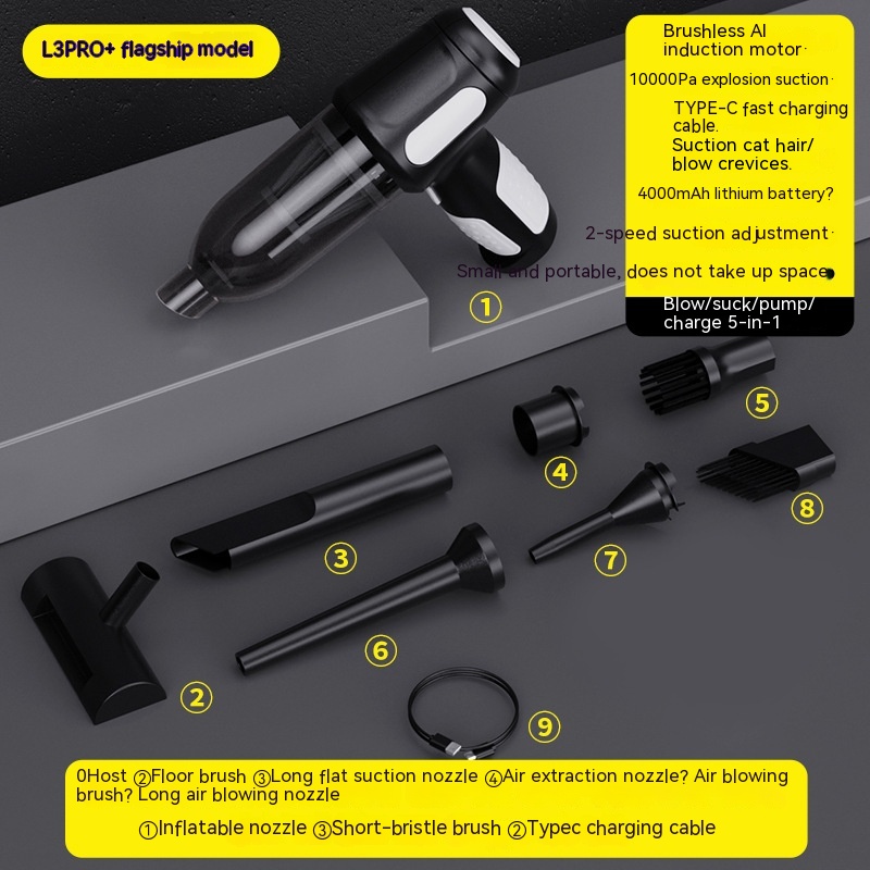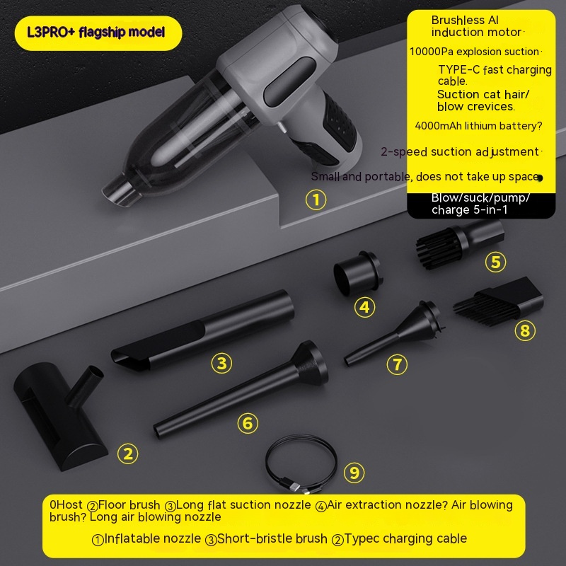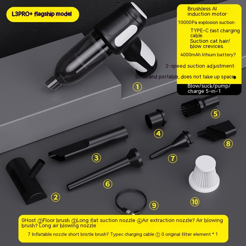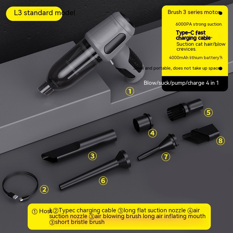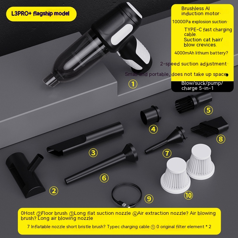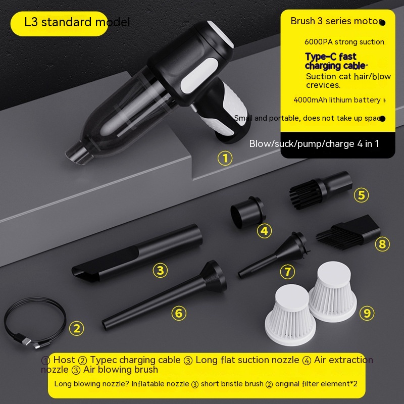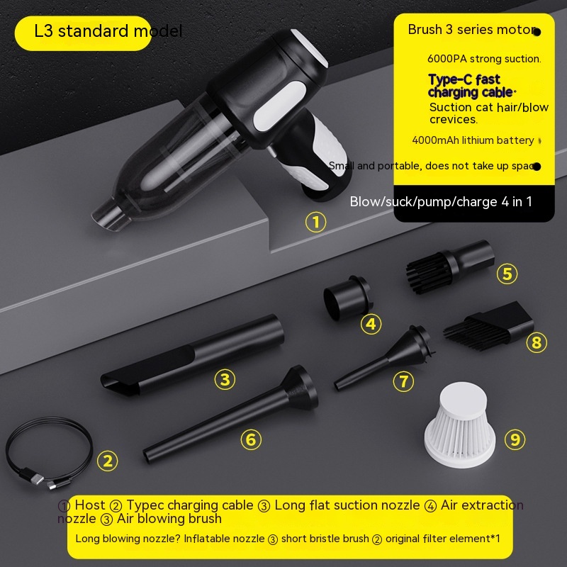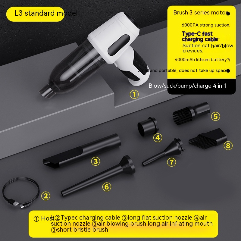 Color classification: [standard black] 6KPa strong suction-4 in 1 blowing suction charge-Type-C fast charging port-4000mAh lithium battery, [Standard White] 6KPa strong suction-4-in-1 blowing suction charge-Type-C fast charging port-4000mAh lithium battery, [Standard Gray] 6KPa strong suction-4 in 1 blowing suction charge-Type-C fast charging port-4000mAh lithium battery, [Flagship Black] 1WPa brushless two-gear explosion suction-5-in-1 suction blowing charging-Type-C fast charging port-4000mAh lithium battery, [Flagship White] 1WPa brushless two-gear explosion suction-5-in-1 suction blowing charging-Type-C fast charging port-4000mAh lithium battery, [Flagship Gray] 1WPa brushless two-gear explosion suction-5-in-1 suction and blowing charge-Type-C fast charging port-4000mAh lithium battery, [Standard Model-Black] 1 filter element, [Standard Model-white] 1 filter element, [Standard Model-Gray] 1 filter element, [flagship model-Black] 1 filter element, [flagship model-white] 1 filter element, [Flagship-Gray] 1 filter element, [standard-Black] 2 filter elements, [standard-white] 2 filter elements, [standard-Gray] 2 filter elements, [Flagship-Black] 2 filter elements, [flagship-white] 2 filter elements, [flagship-Gray] 2 filter elements, [standard-Black] 3 filter elements, [Standard Model-white] 3 filter elements, [Standard Model-Gray] 3 filter elements, [flagship model-Black] 3 filter elements, [flagship model-white] 3 filter elements, [Flagship-Gray] 3 filter elements