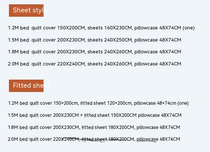 Applicable bed size: 1.2m/3 piece set 1.5m/4 piece set 1.8m/4 piece set 2.0m/4 piece set