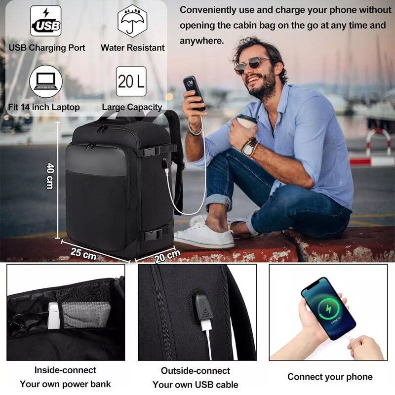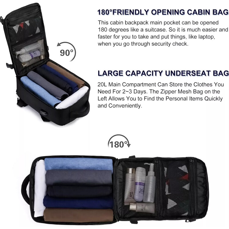 PERFECT SIZE FITS UNDER SEAT AND APPROVED BY MOST FLIGHTS - the size and design of this backpack are spot-on for airline travel. It fits perfectly within the carry-on size restrictions of budget airlines, including for Easyjet, and even slides easily under the seat, providing convenient access to the essentials during the flight. It can be opened 180°like a suitcase for quickly passing through airport security. The underseat cabin bag 40x20x25 offers you a hassle-free travel experience.