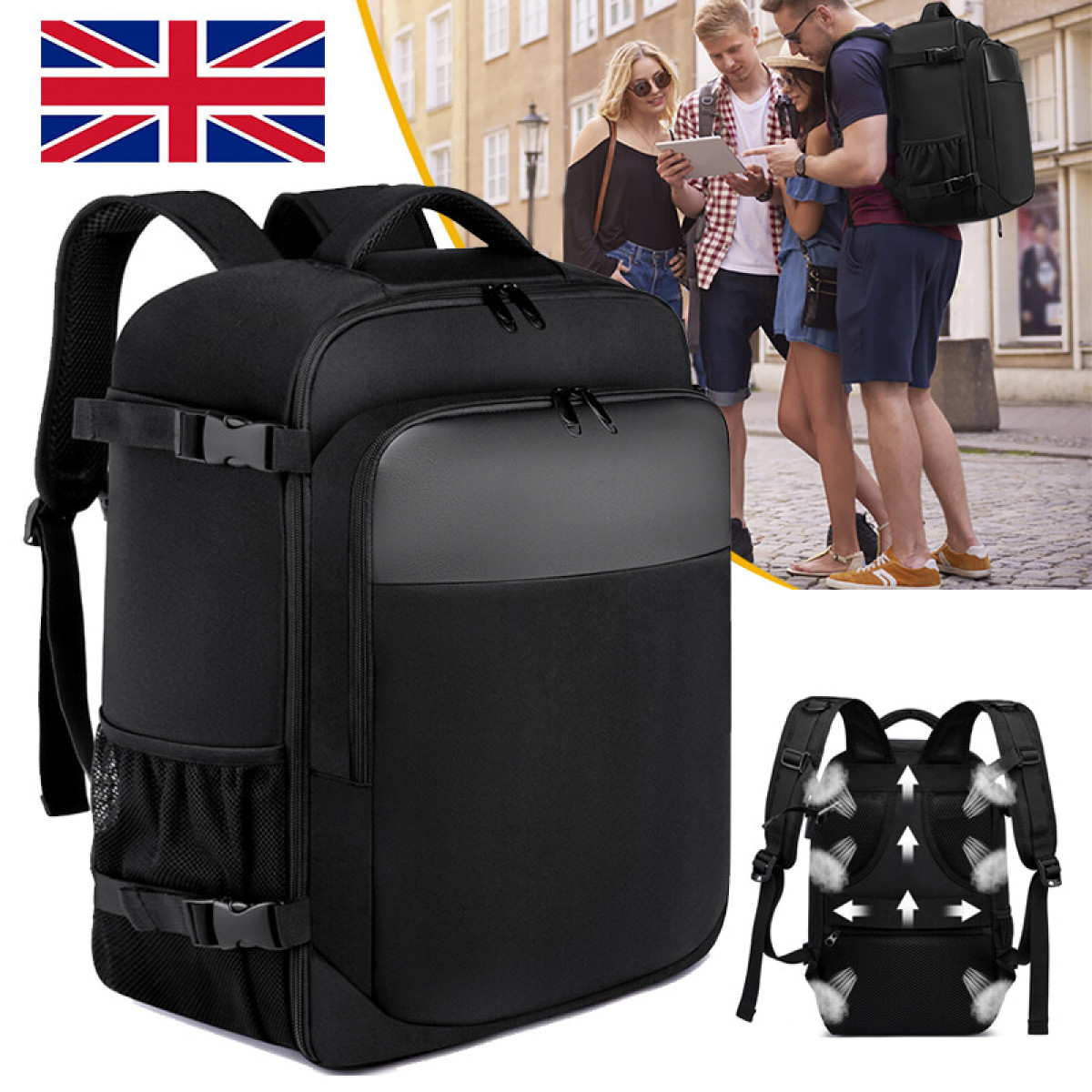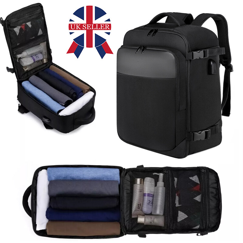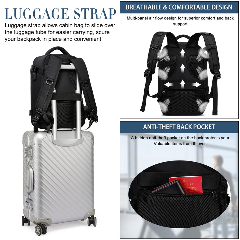 TROLLEY SLEEVE & ANTI THEFT BACK POCKET &SIDE COMPRESSION STRAPS - Trolley sleeve slides over rolling luggage handle to free your shoulders and make your journey easier; A security pocket at the back with zipper design for your wallet and passport; With compression straps on both side are handy for cinching down the bag when it's not fully packed, keeping it compact and streamlined; Serve as a travel bag, carry on luggage, hand luggage trolley, cabin baggage, mens travel backpack cabin size.