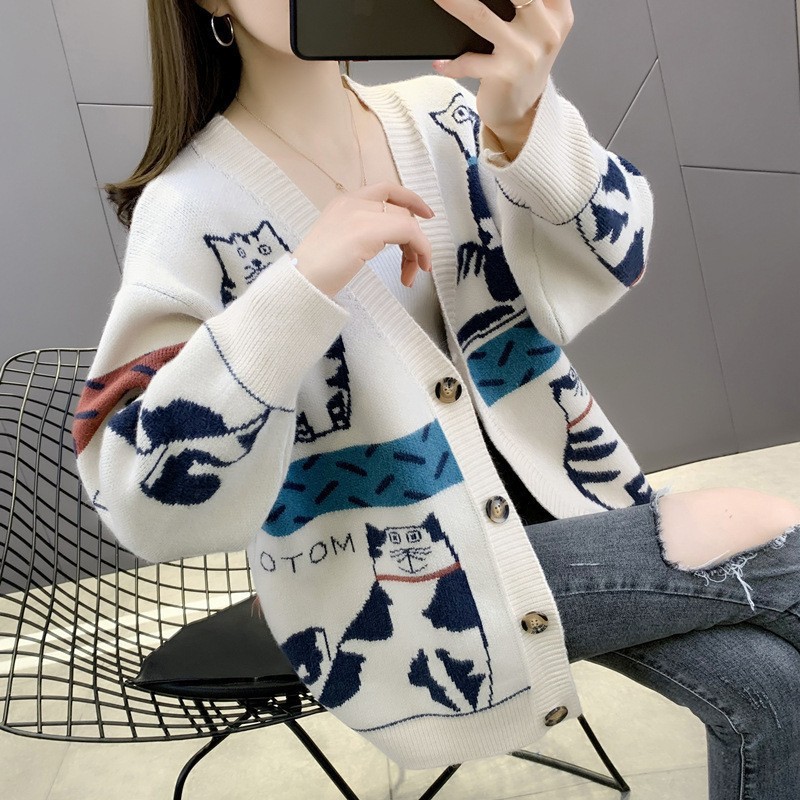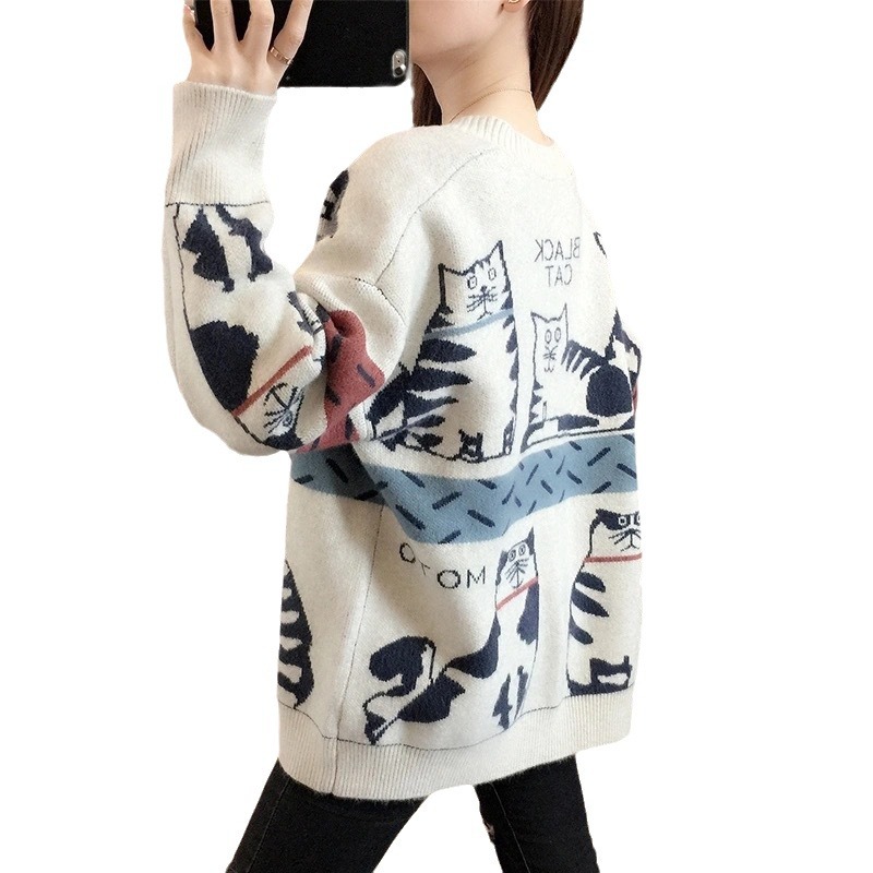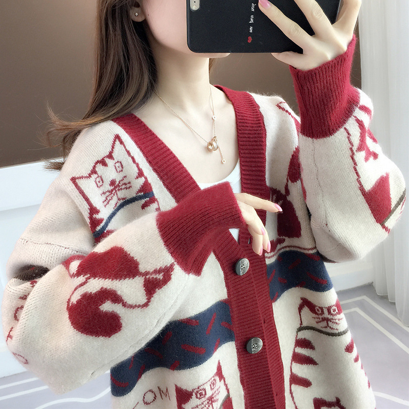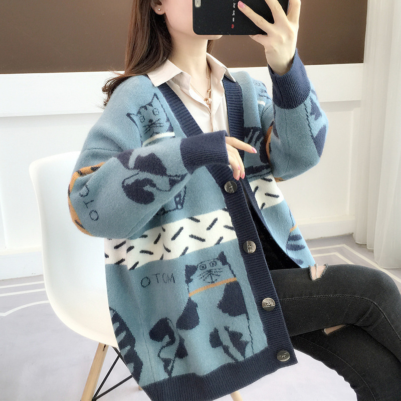 Cartoon Cat Contrast Color Sweater Coat For Women Autumn And Winter New Loose And Lazy Style Fashionable All-match Knitted Cardigan