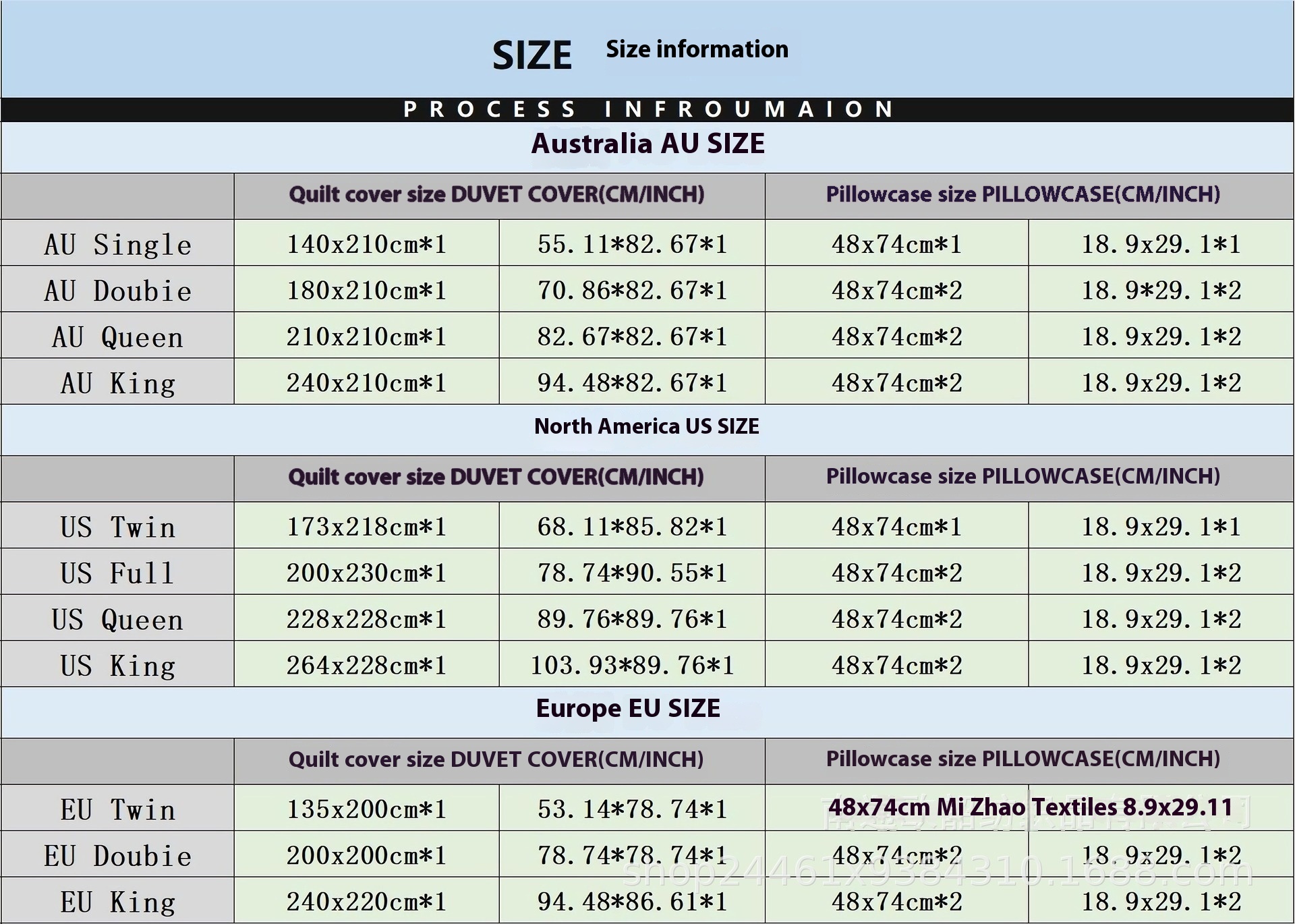 Size specification: AU single quilt cover 140*210 pillowcase 50*75*1, au double quilt cover 180*210 pillowcase 50*75*2, au queen quilt cover 210*210 pillowcase 50*75*2,US twin quilt cover 173*218 pillowcase 50*75*1,US full quilt cover 200*230 pillowcase 50*75*2,US queen quilt Cover 229*229 pillowcase 50*75*2,US King quilt cover 264*228 pillowcase 51*91*2,EU twin quilt cover 135*200 pillowcase 50*75*1,EU double quilt cover 200*200 pillowcase 50*75*2,EU king quilt cover 220*240 pillowcase 50*75*2, quilt cover 70*133 pillowcase 50*75*1