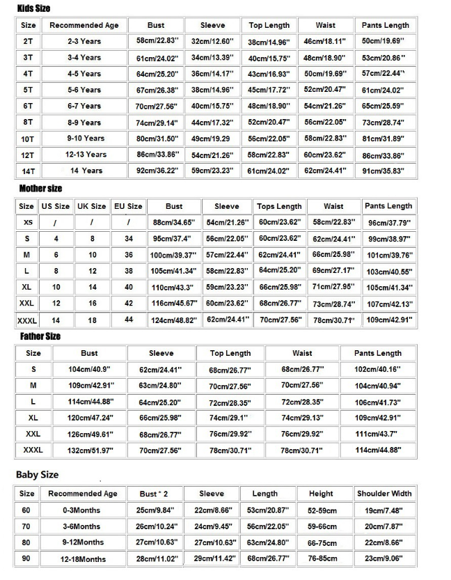 Suitable height: Dad S, Dad M, Dad L, Dad XL, Dad XXL, Dad 3XL, Mom S, Mom M, Mom L, Mom XL, Mom XXL, Mom 3XL, Kids 2T, Kids 3T, Kids 4T, Kids 5T ,Kids 6T,Kids 8T,Kids 10T,Kids 12T,Kids 14T,Baby 60(0-3M),Baby 70(3-6M),Baby 80(9-12M),Baby 90(12-18M)