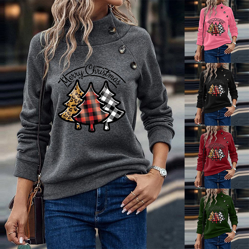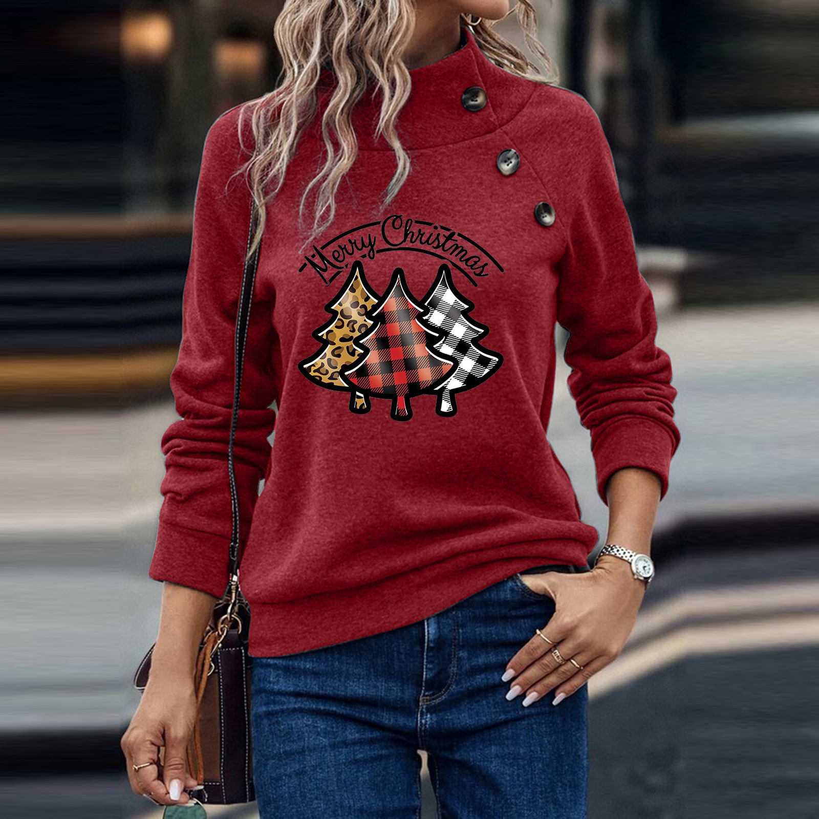 Cartoon Turtleneck Buttons Christmas Printed Sweater For Women