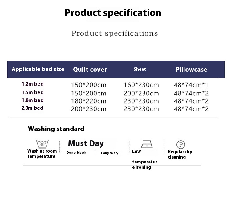 Size specifications: 1.2m bed sheet three-piece set, 1.5m bed sheet four-piece set, 1.8m bed sheet four-piece set, 2.0m bed sheet four-piece set