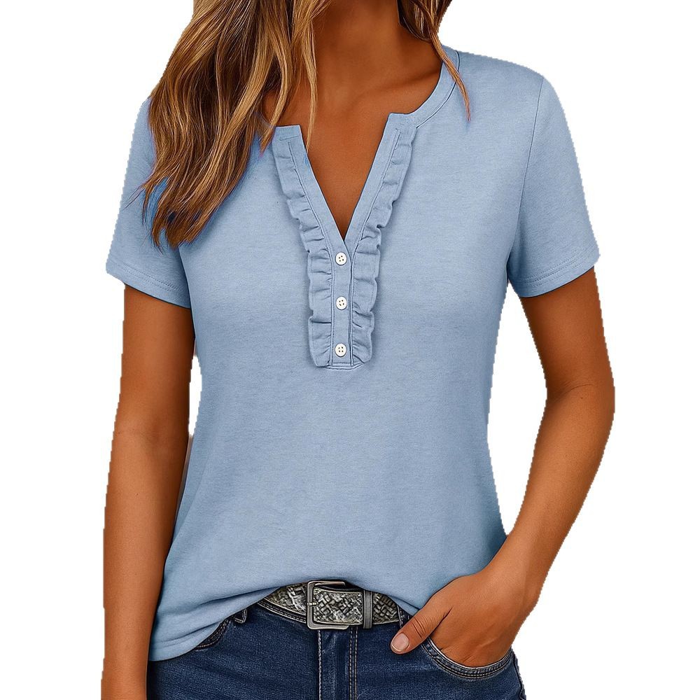Trendy Elements: Solid color, buttons, patchwork, ruffled trim