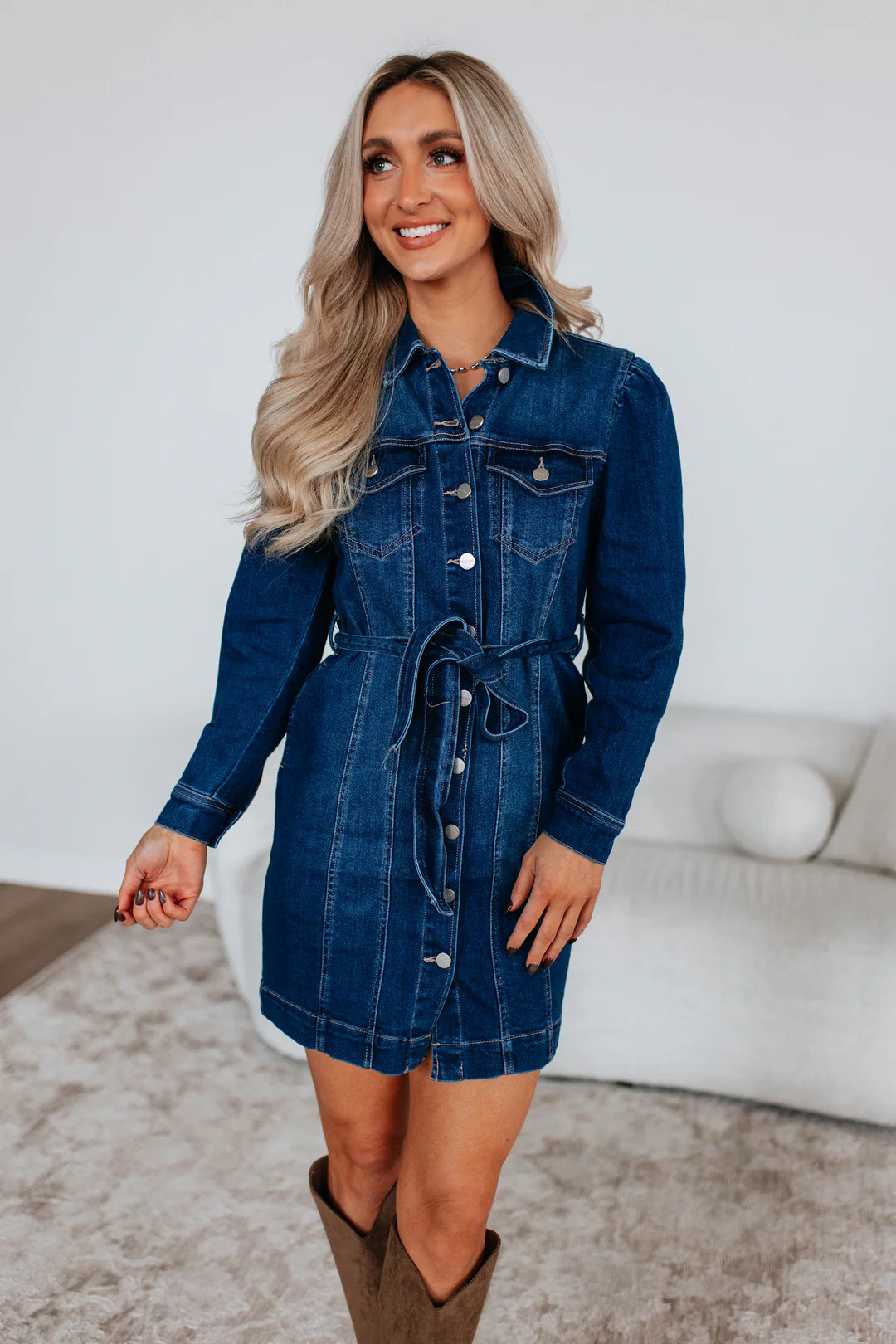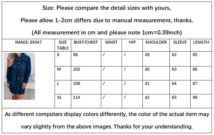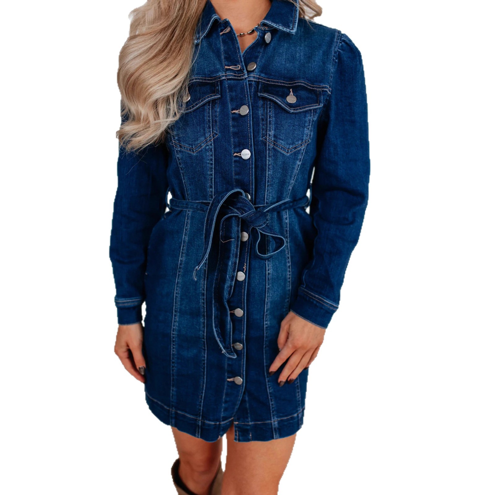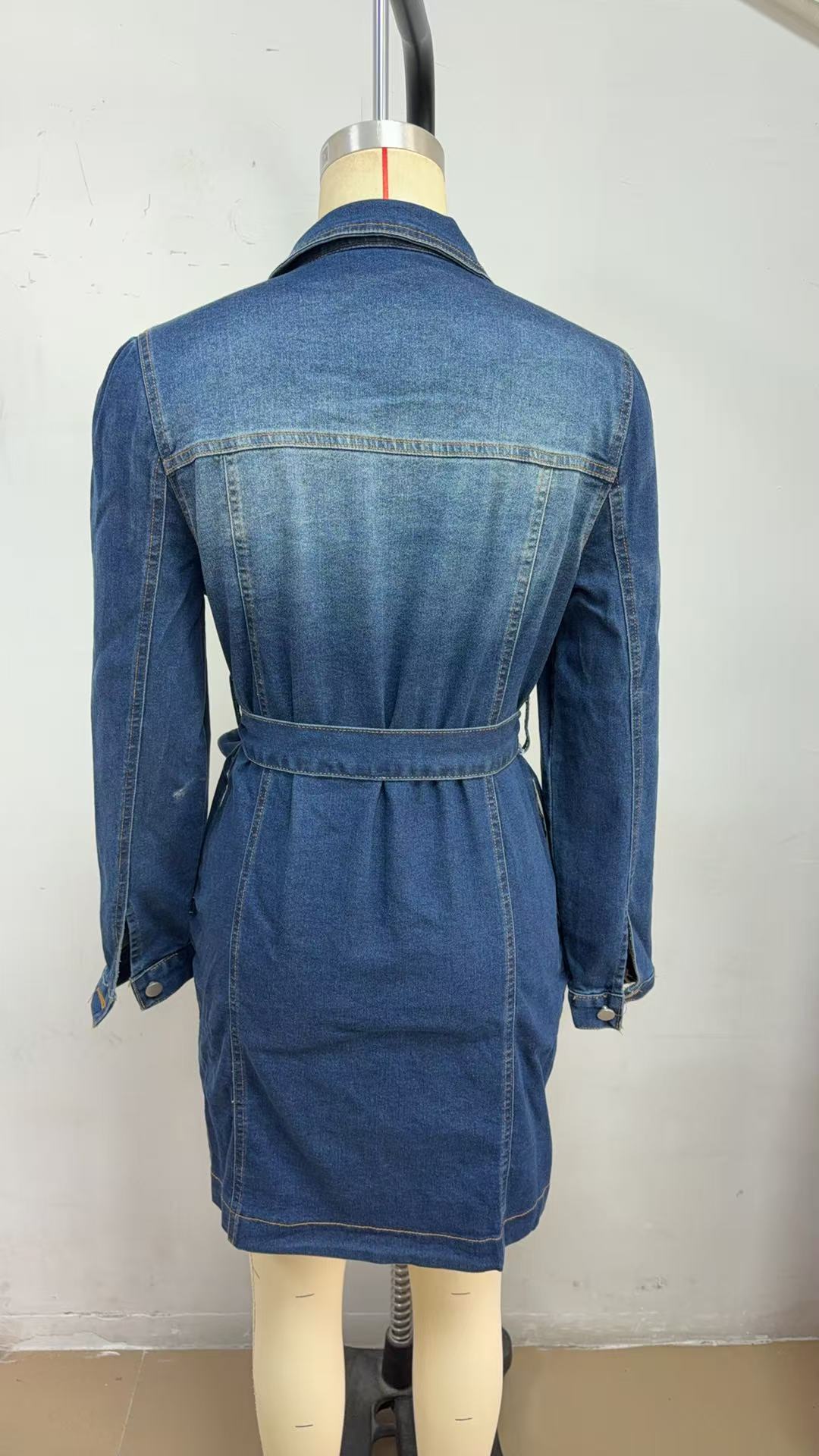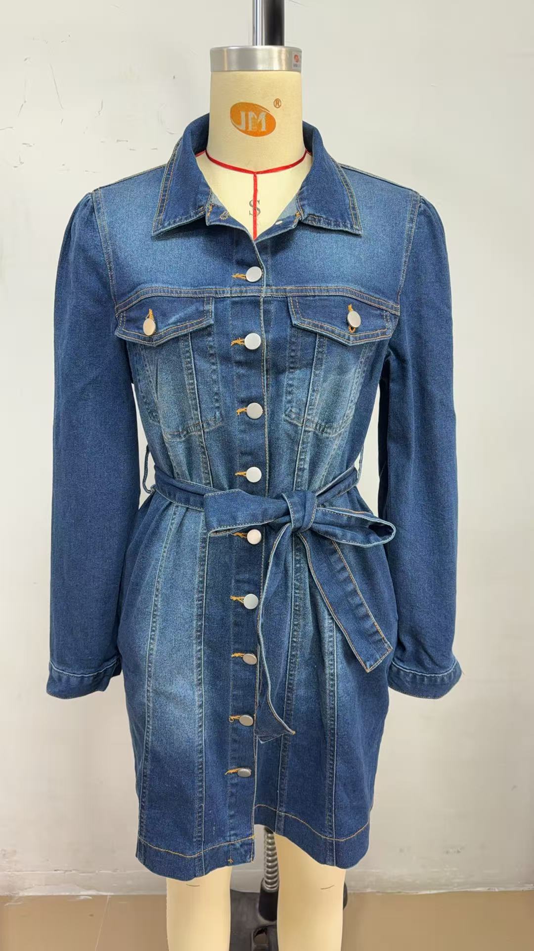 Casual Buttoned Lace Up Slimming Long Sleeve Denim Dress For Women