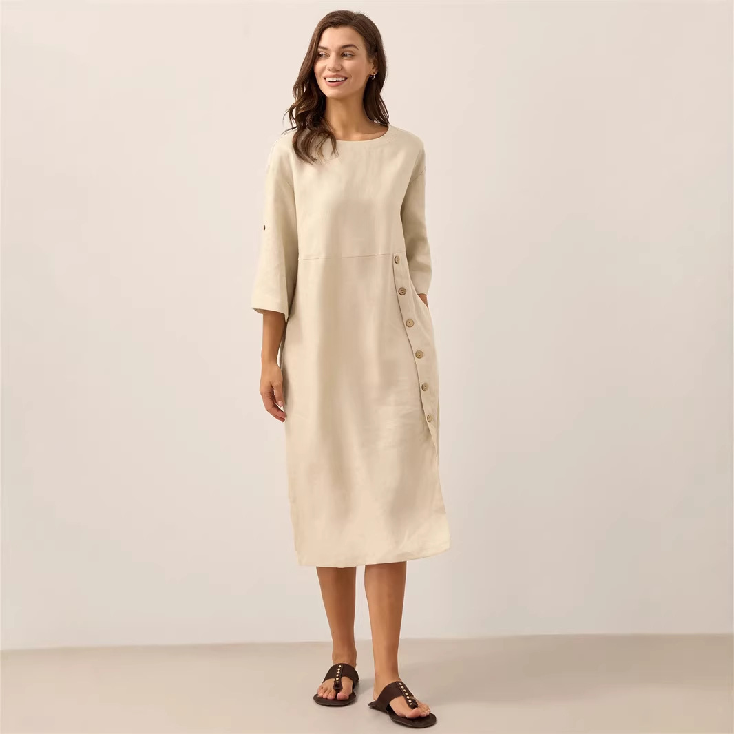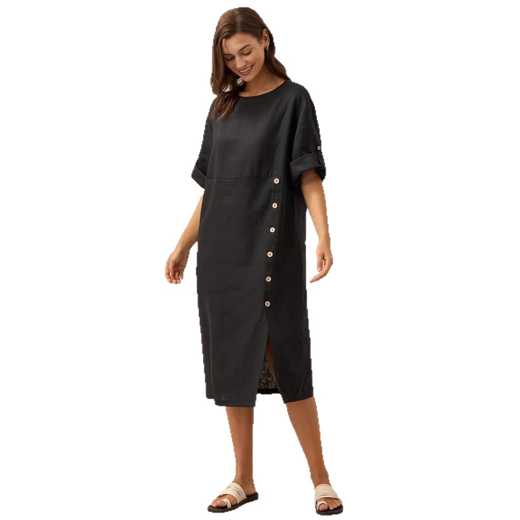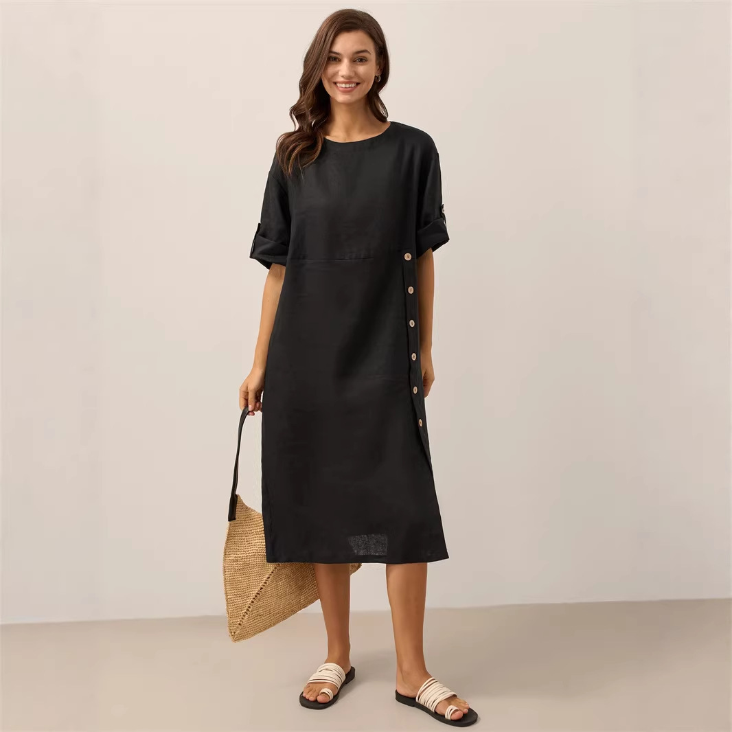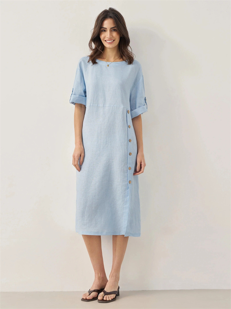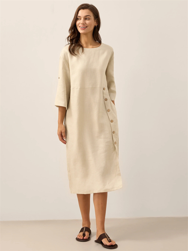 Casual Cotton-Linen Dress With Buttoned Slit And Round Neck