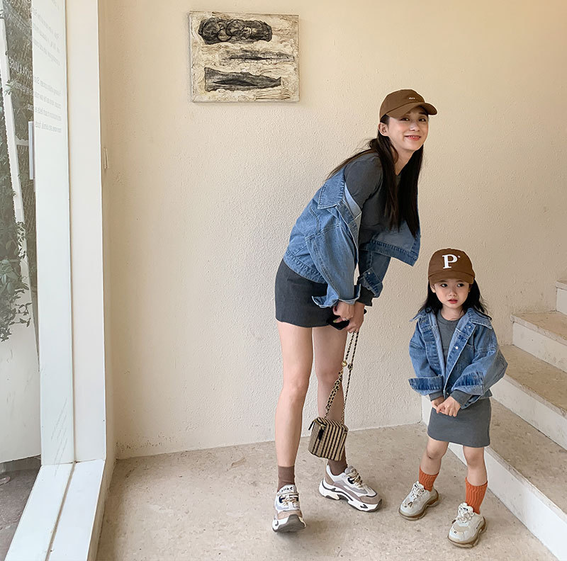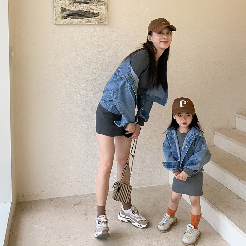 Color: denim jacket, gray skirt