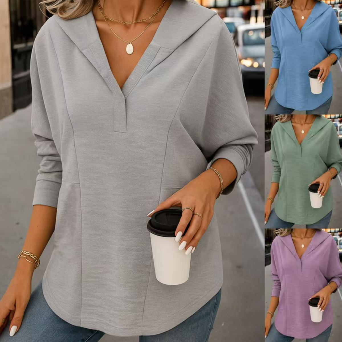 Casual Loose-Fit Fashionable Long-Sleeve Solid-Color Knitted Top With Hood And V-Neck
