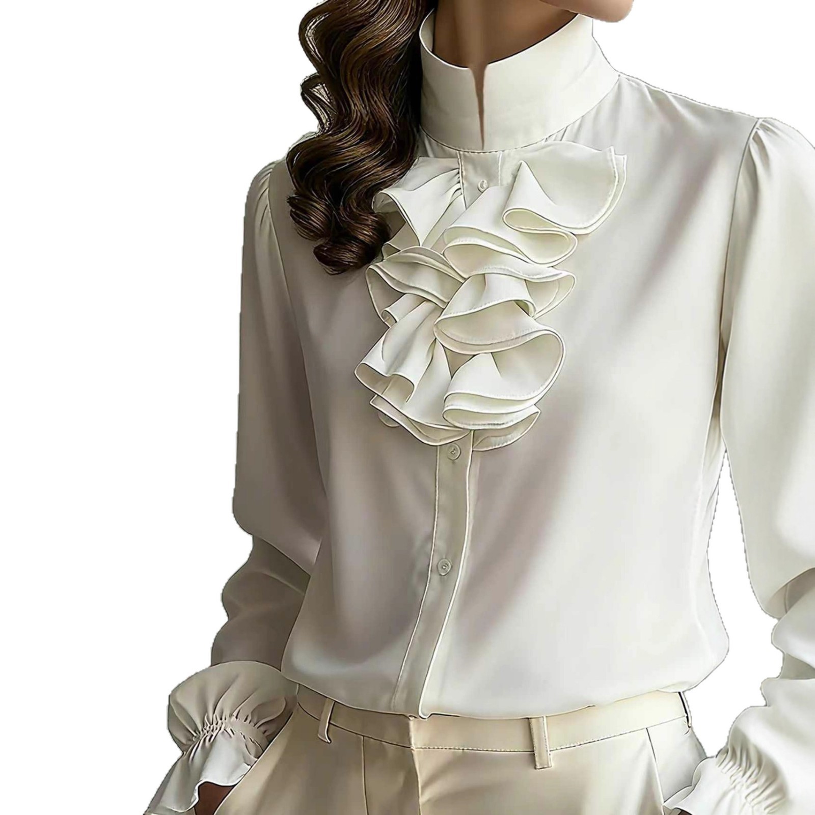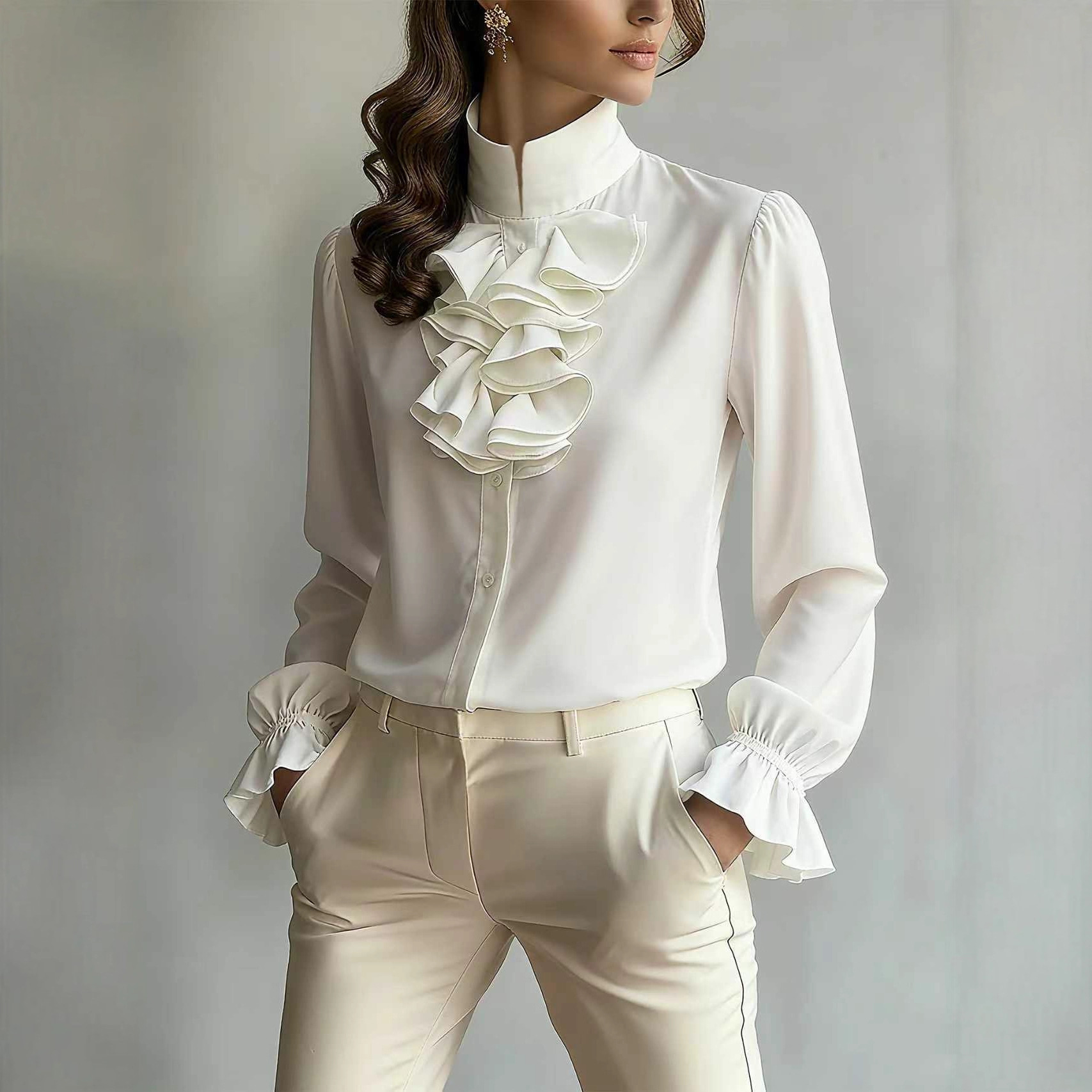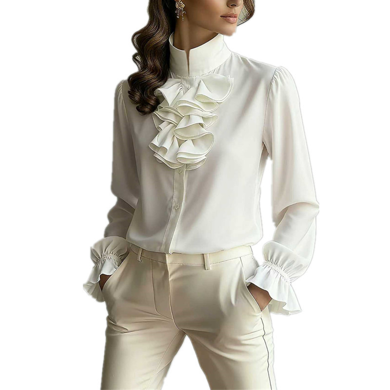 Casual Loose-neck Plain-colored Ruffled Collar Shirt