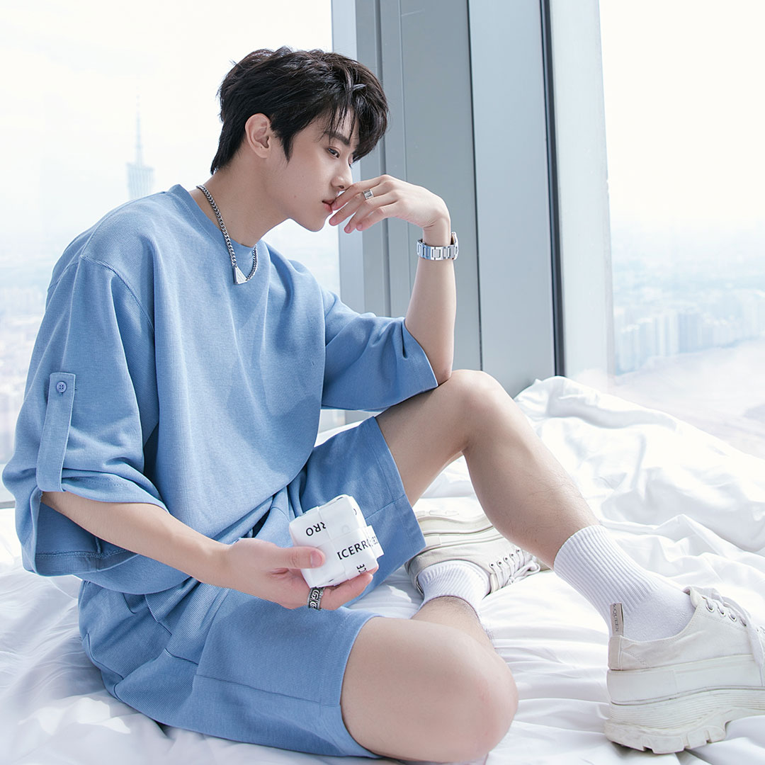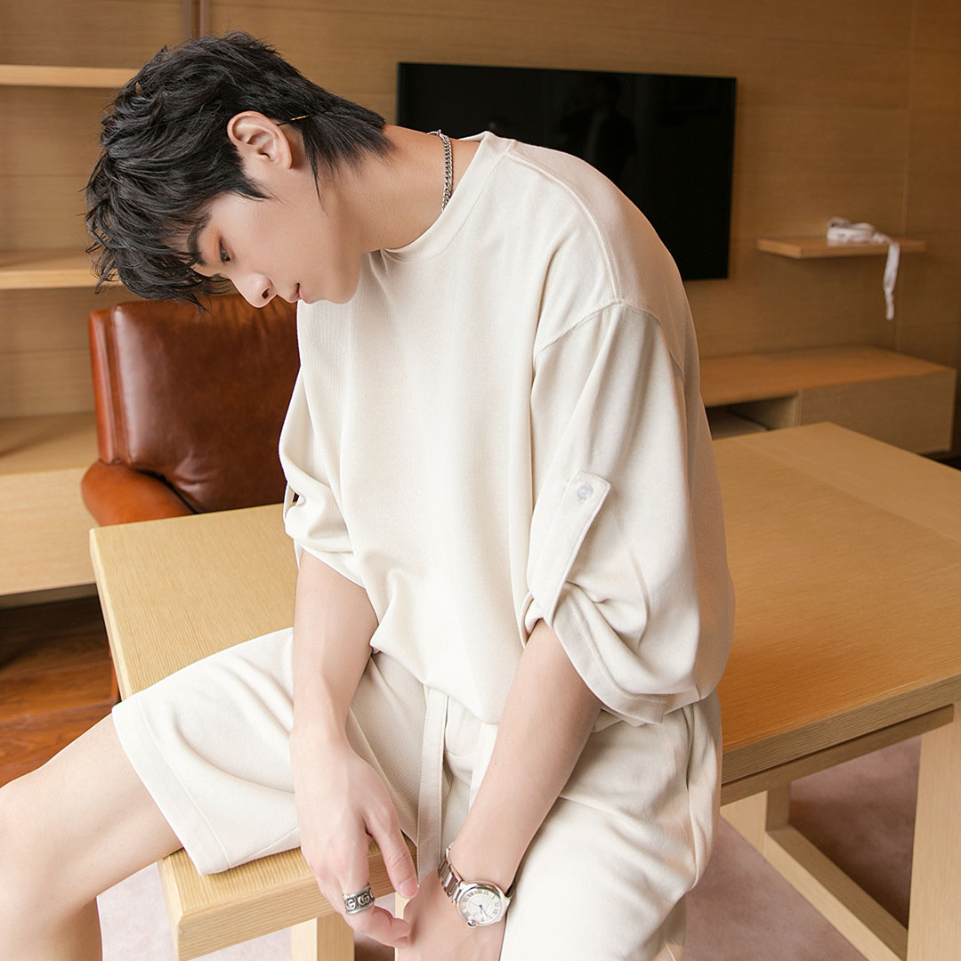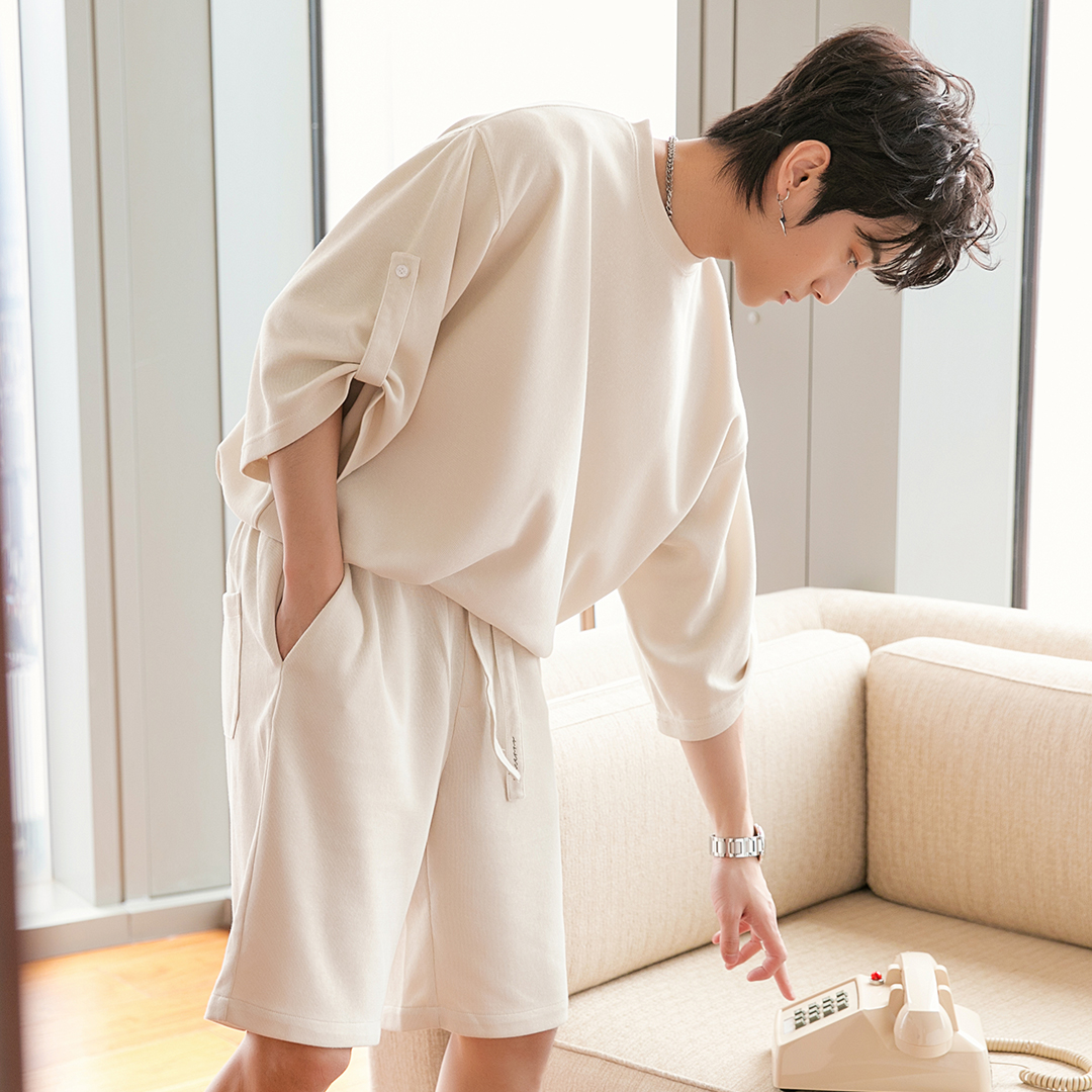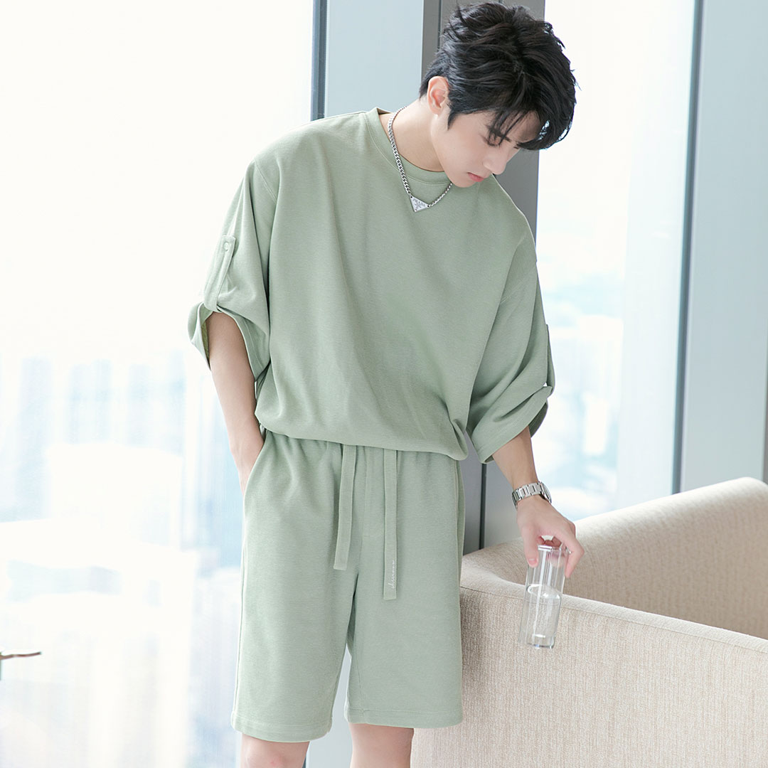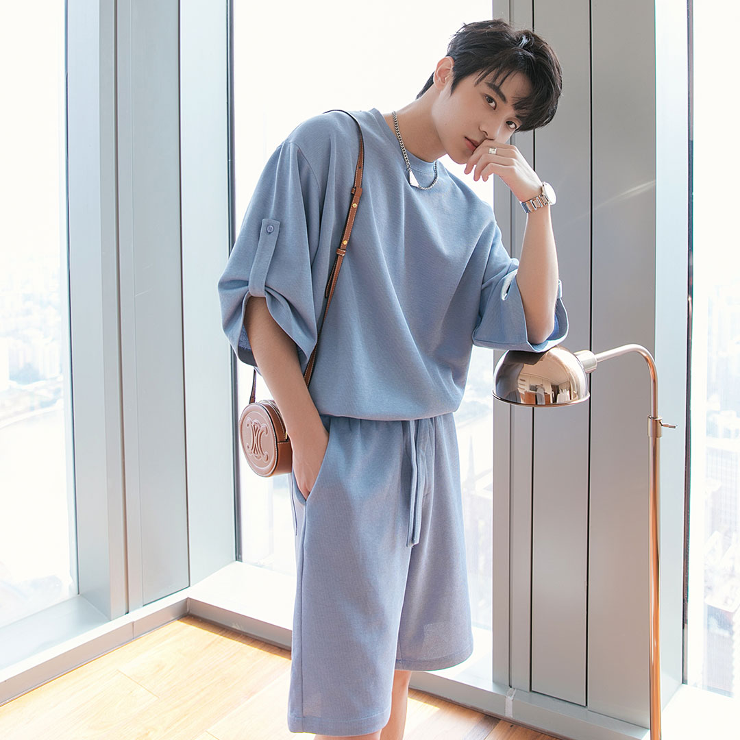 Color classification: sky blue top bean green top light apricot top sky blue shorts light apricot shorts bean green shorts