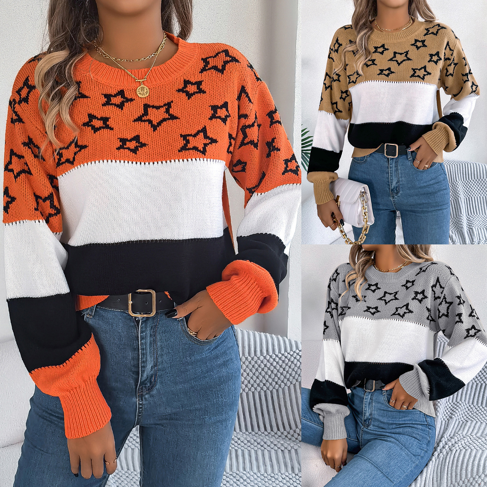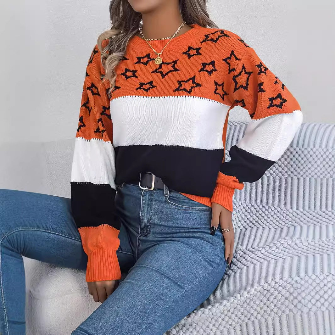 Casual Multicolor Star Hollow Lantern Sleeve Pullover Sweater