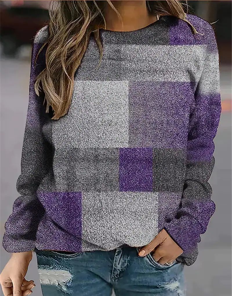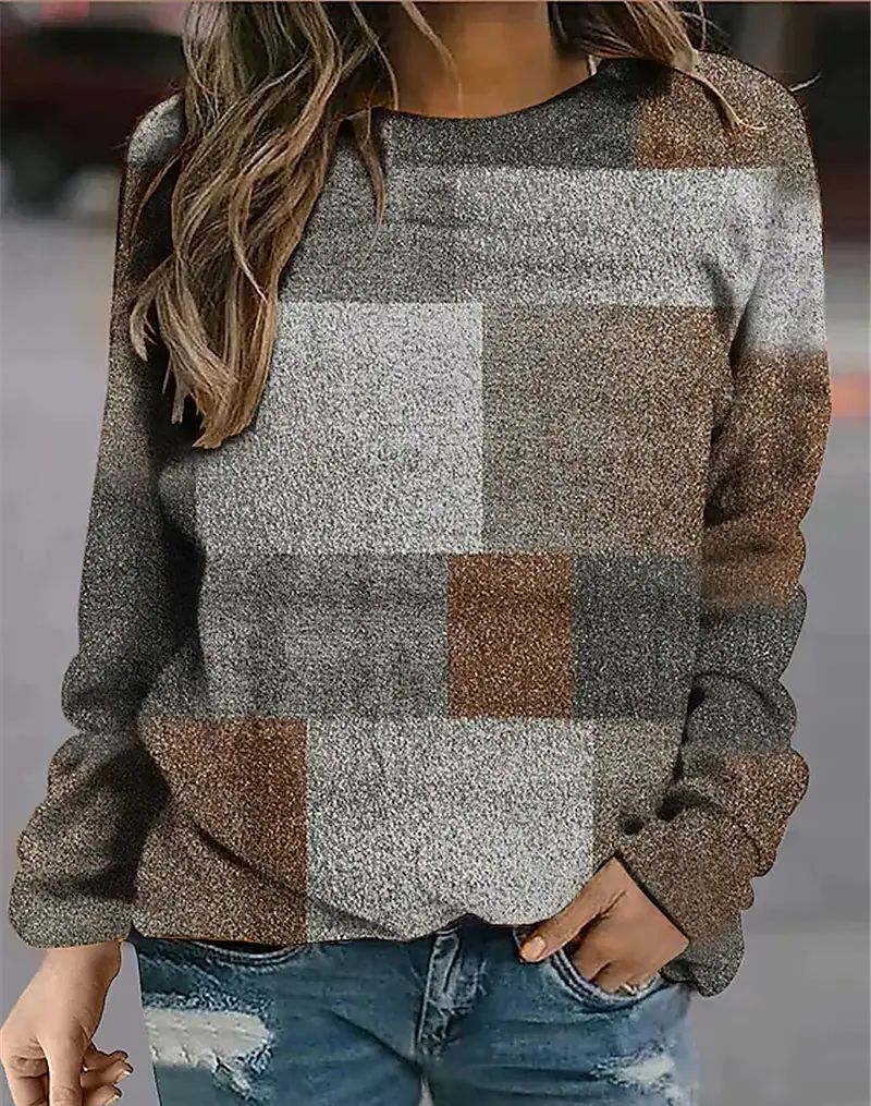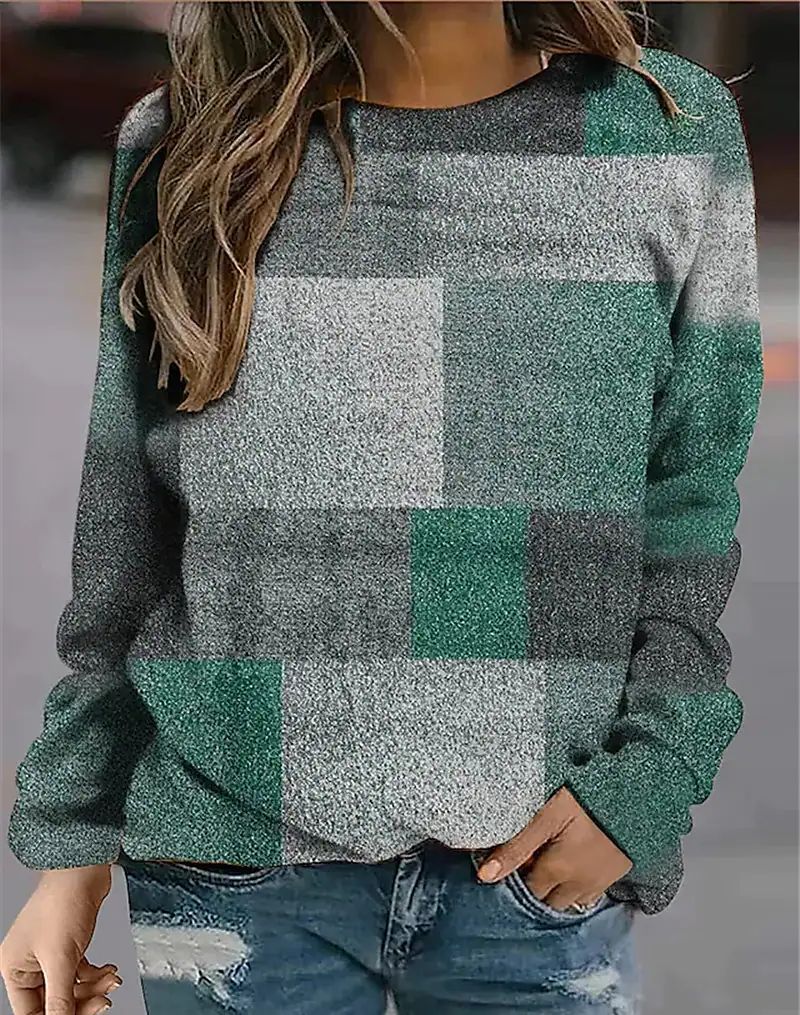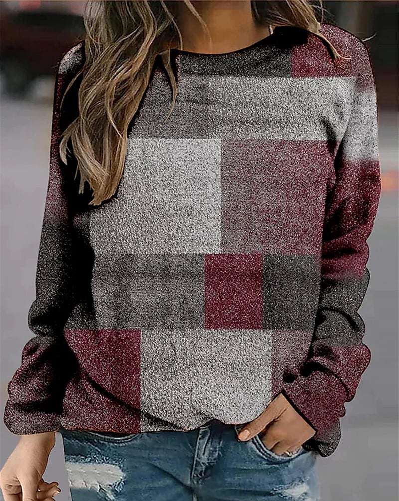 Casual Plaid Loose Print Long Sleeve Crew Neck Sweater Women's