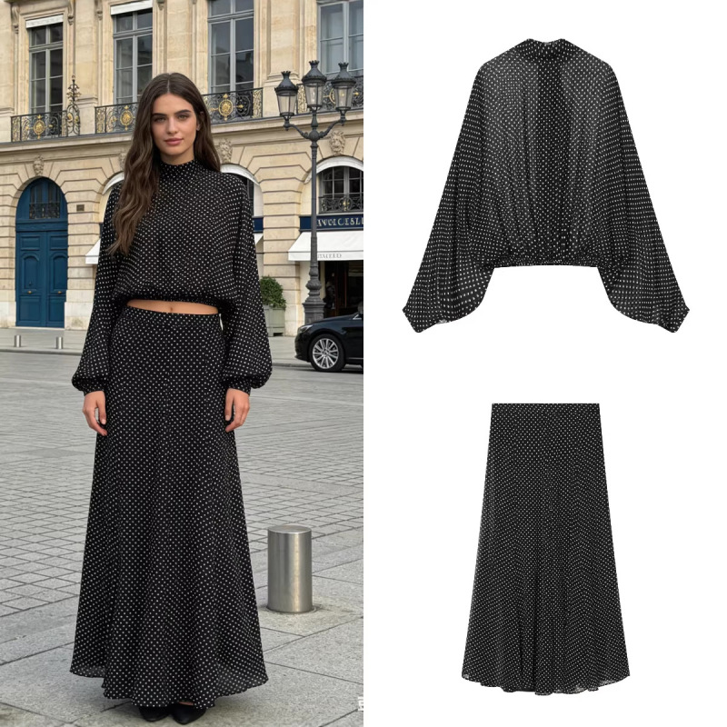 Casual Polka-Dot Bow-Tie Shirt And Polka-Dot Skirt Set