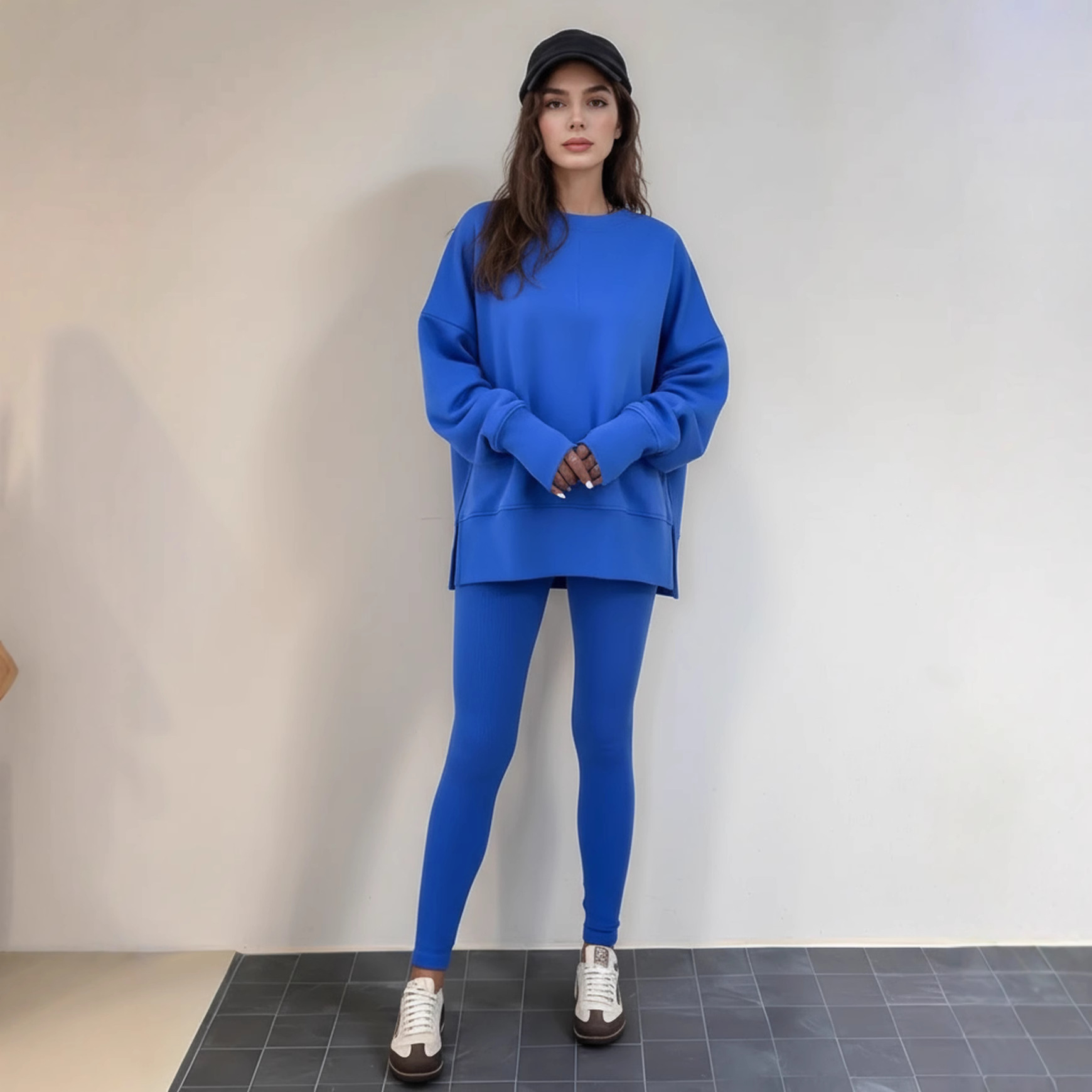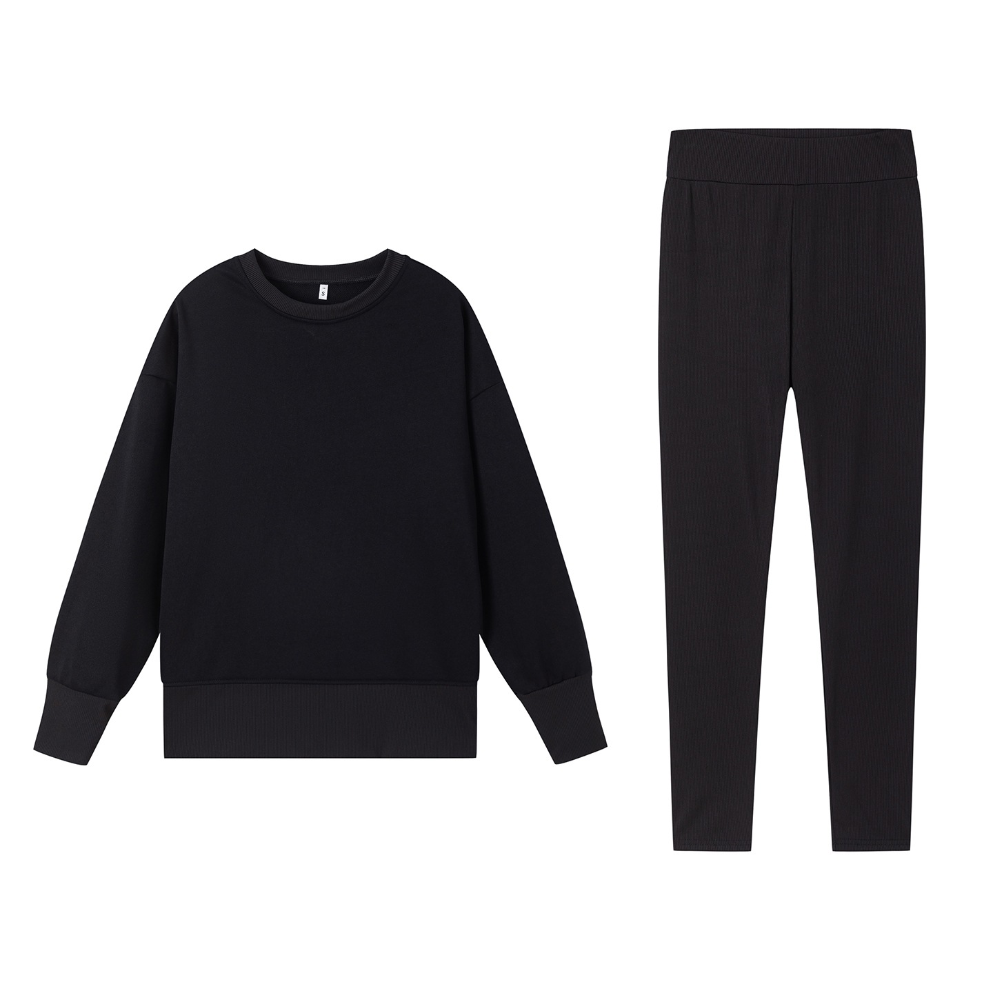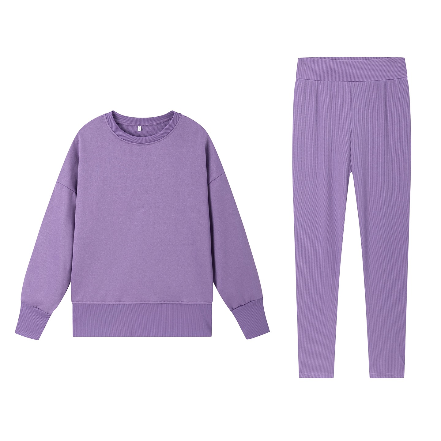 Casual Relaxed Fit Long Sleeve Crew Neck Top With Side Slits Paired With Matching Sweatpants