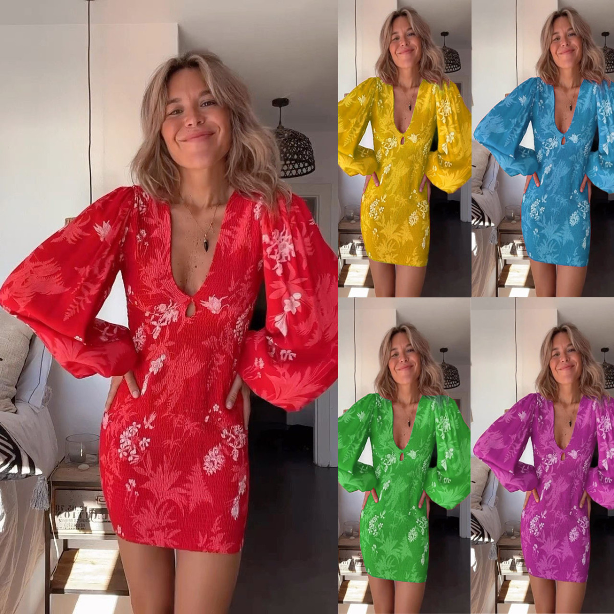 Casual Relaxed-fit Pleated Long-sleeve Sexy V-neck Dress