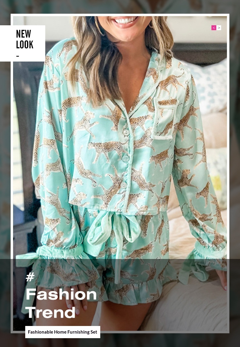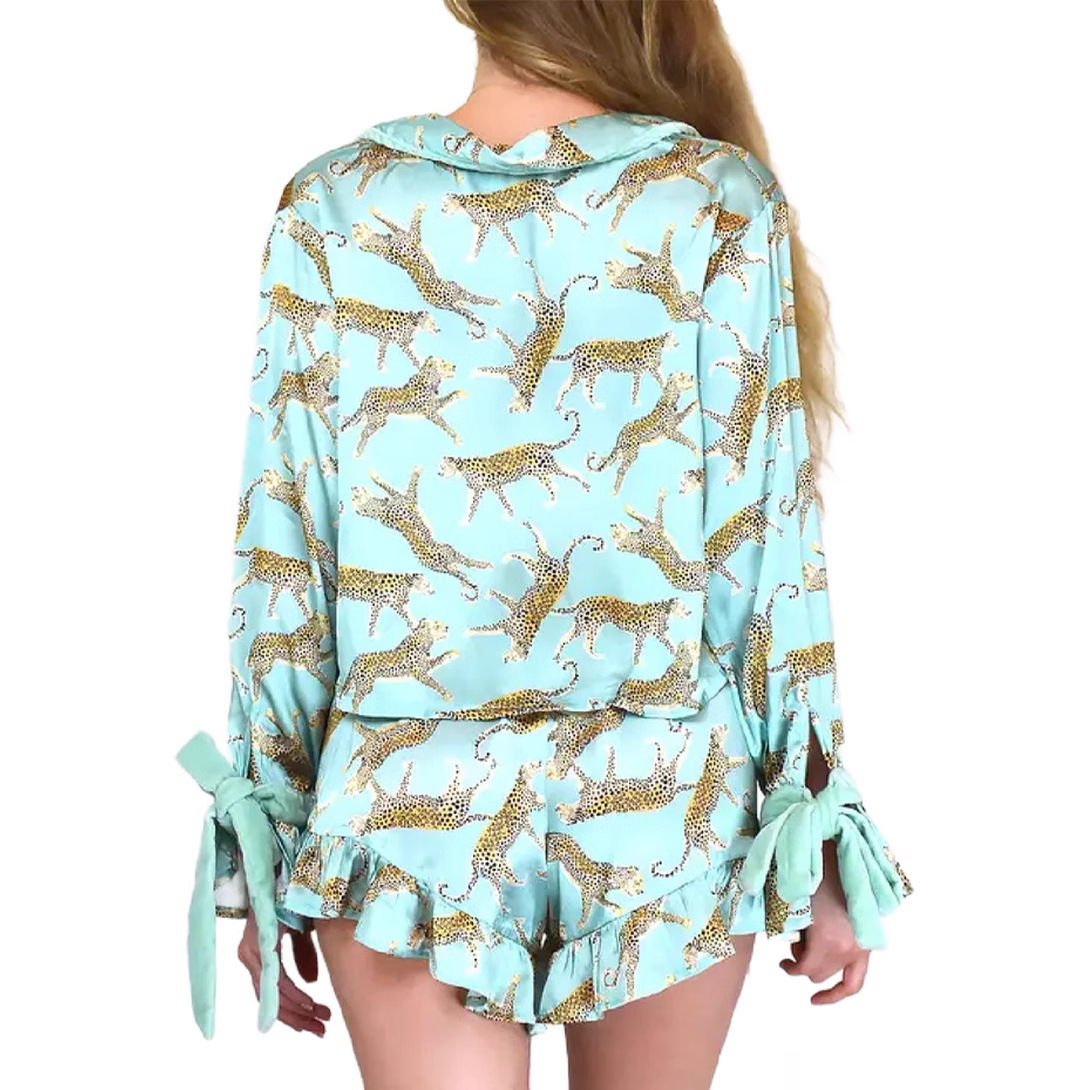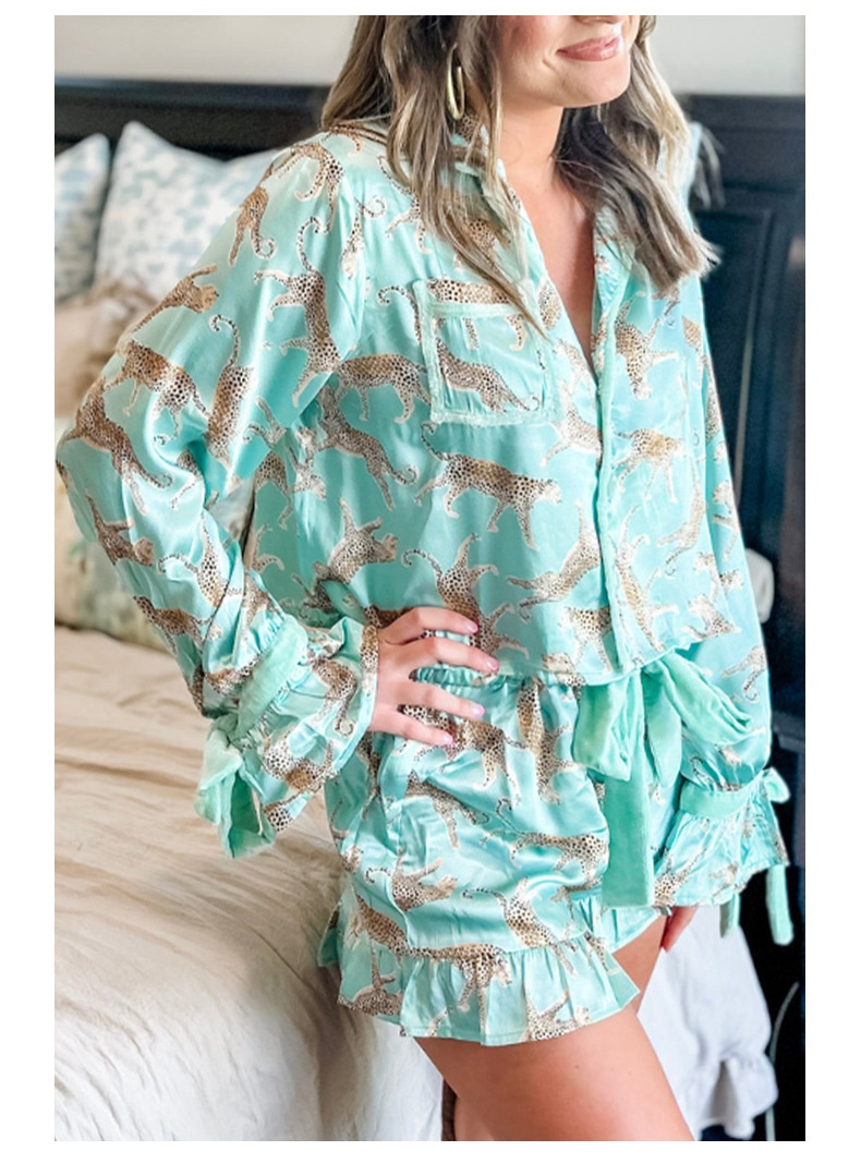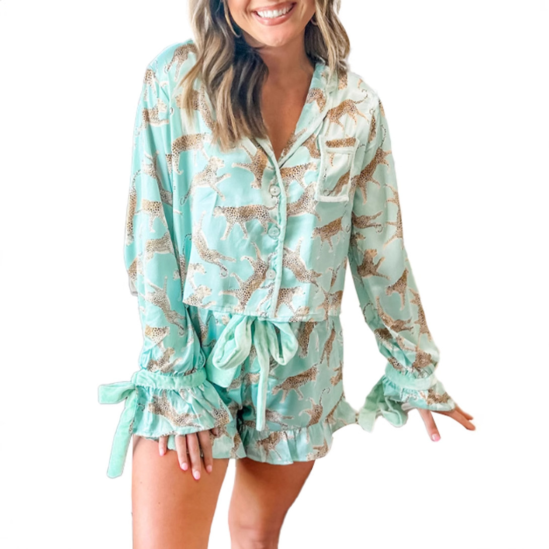 Casual Satin Pajama Set For Women Leopard-Print Long Sleeves And Shorts