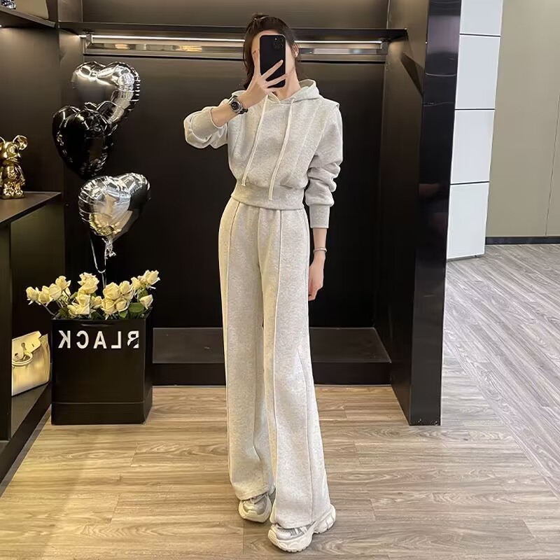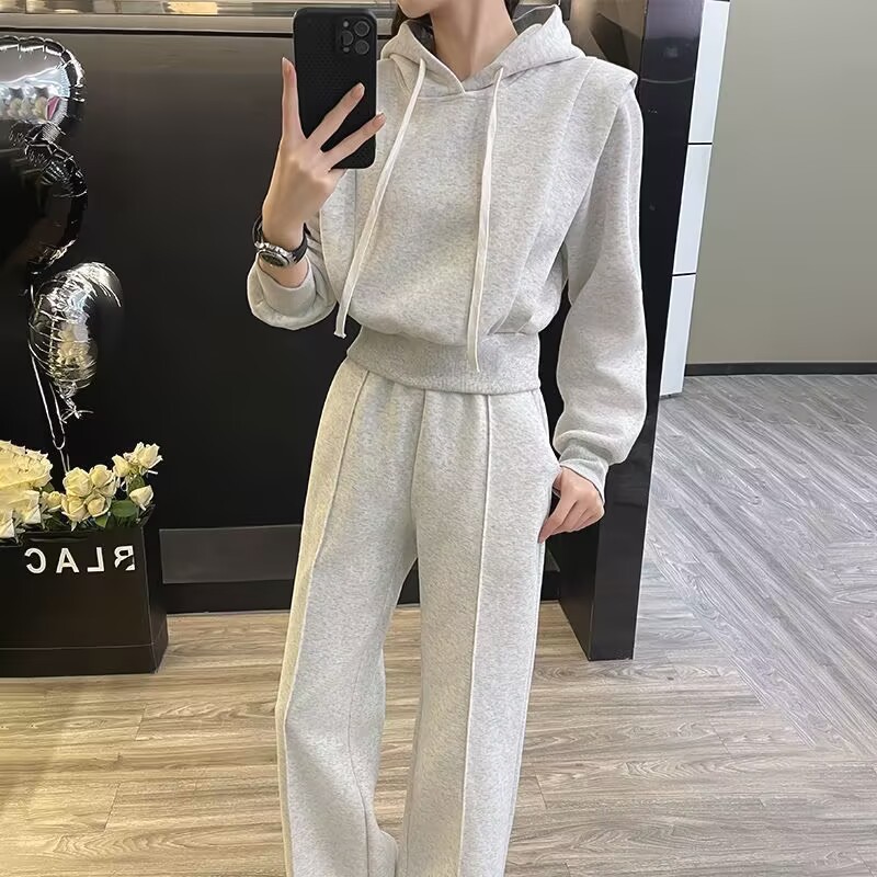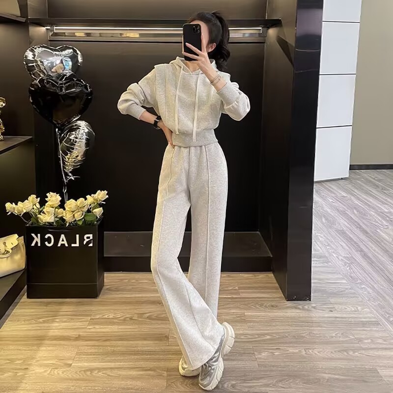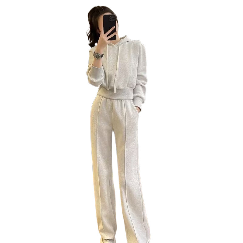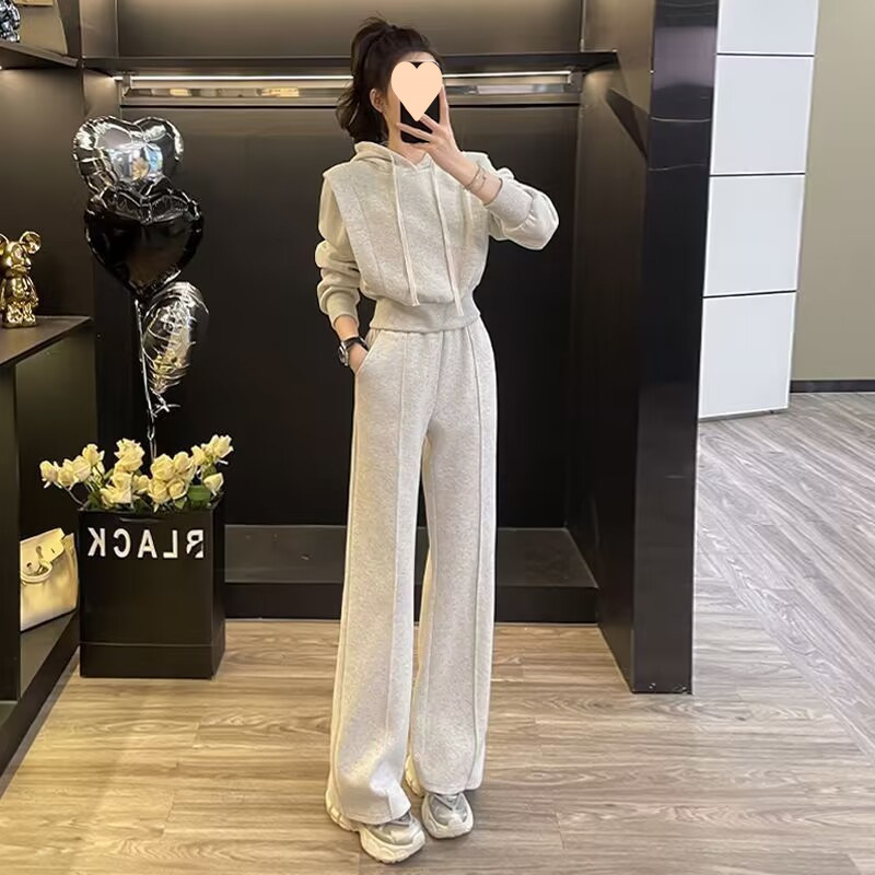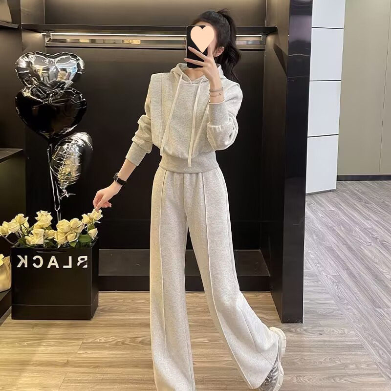 Casual Sportswomen's Autumn Regular Shoulder Hooded Short Sweatshirt And Pants Two-piece Set