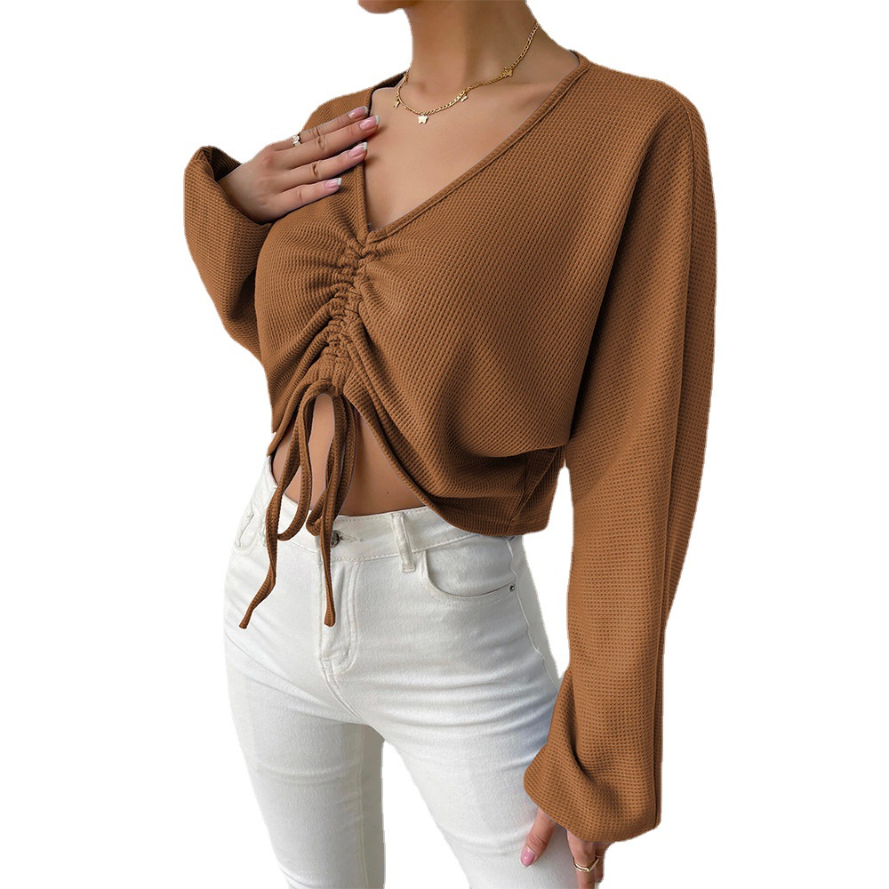 Casual V-neck Drawstring Waffle Long-sleeve T-shirt Crop Top
