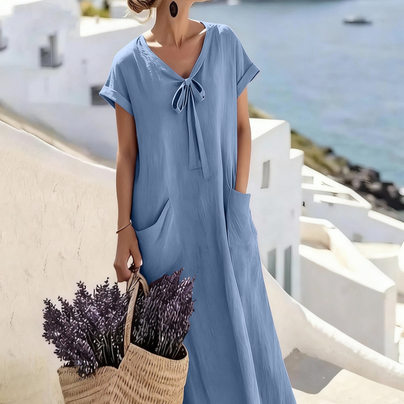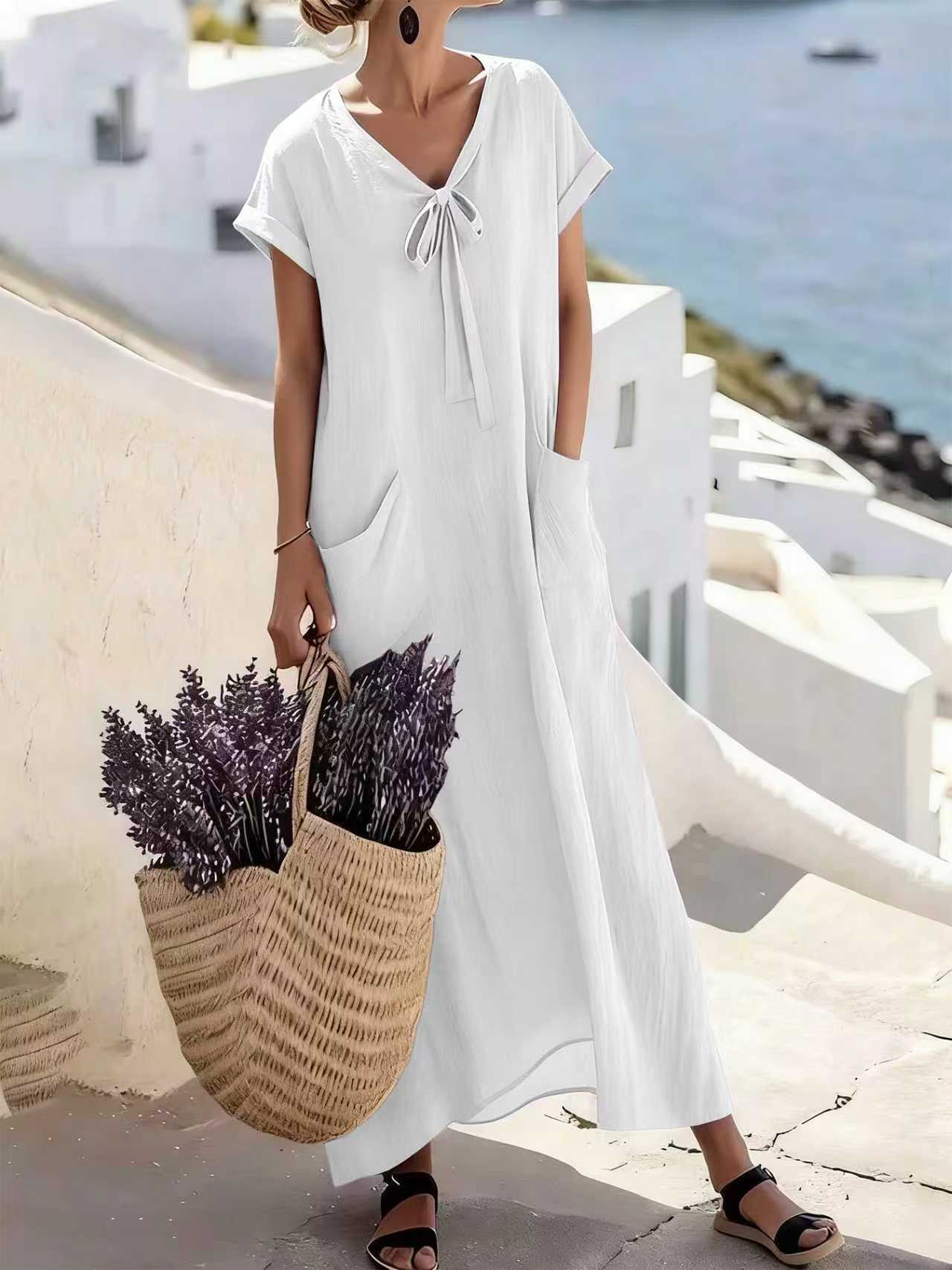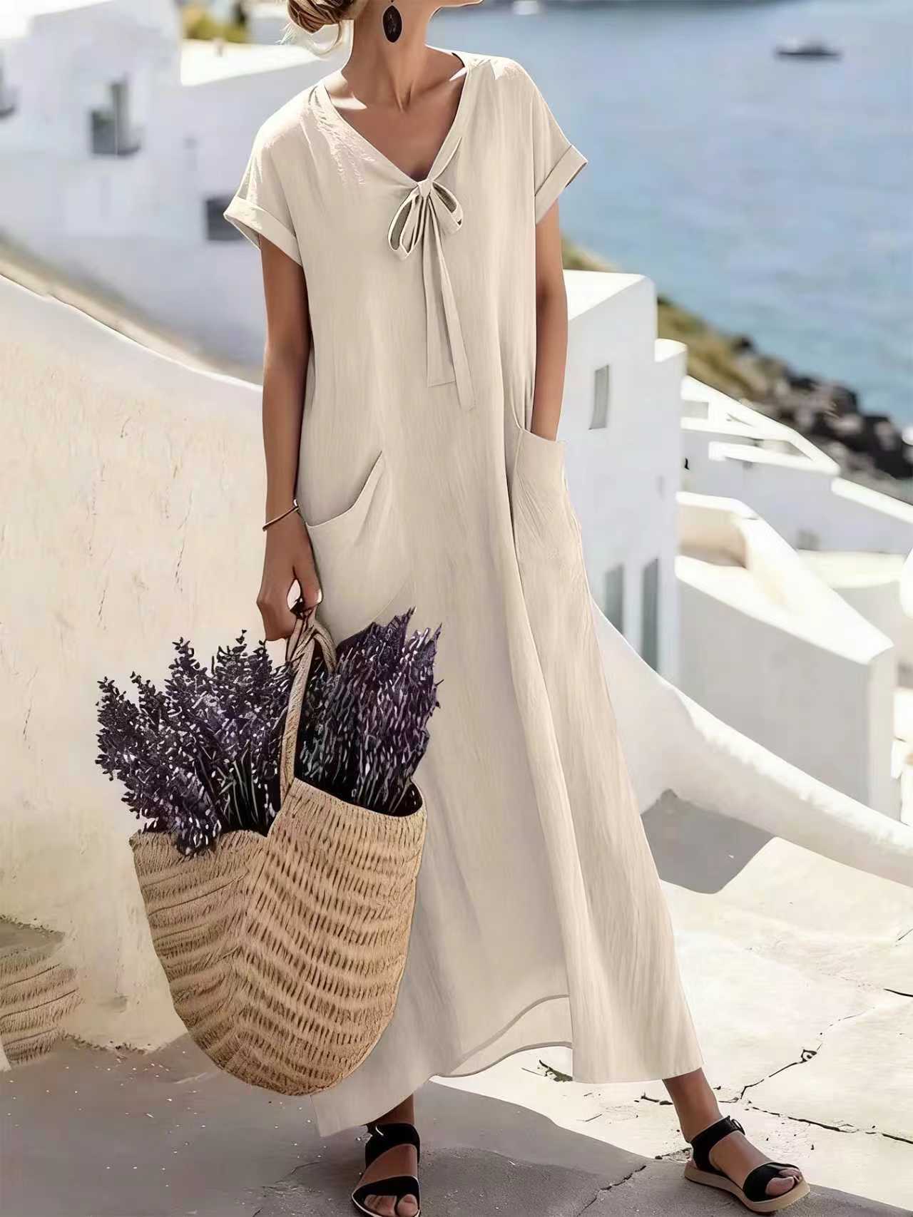 Casual V Neck Lace Up Solid Color Womens Dress