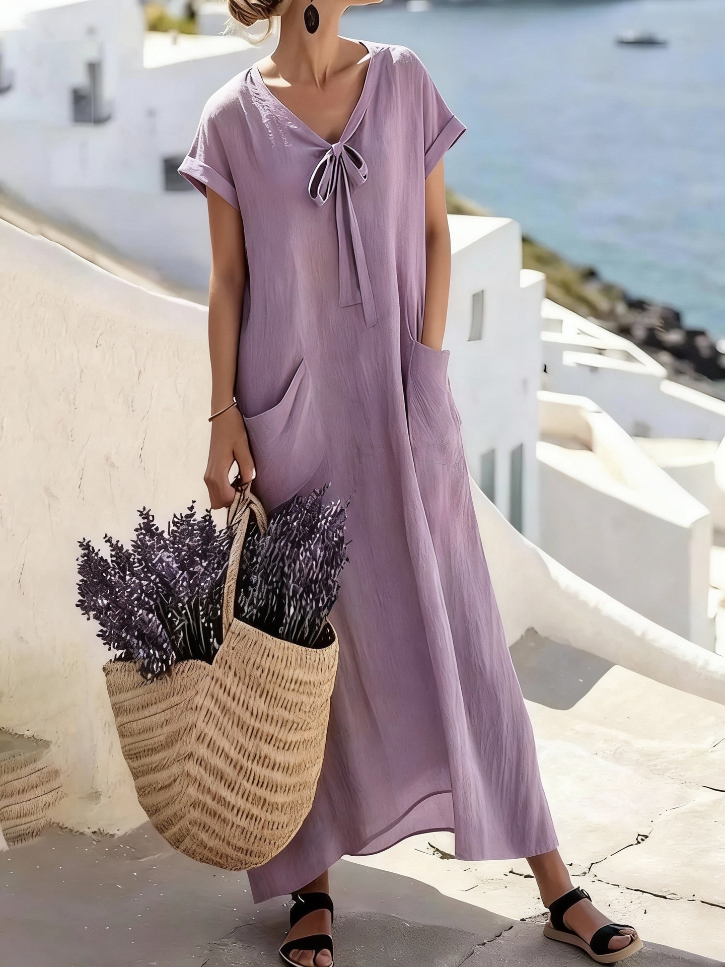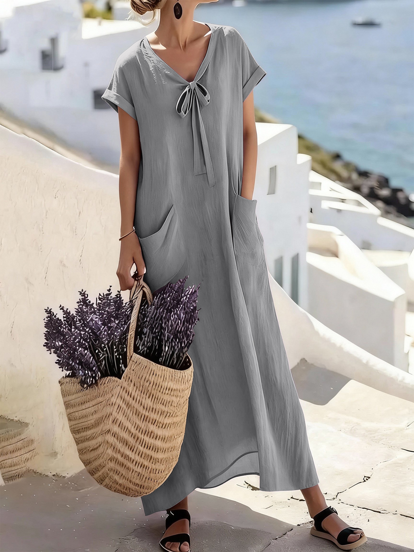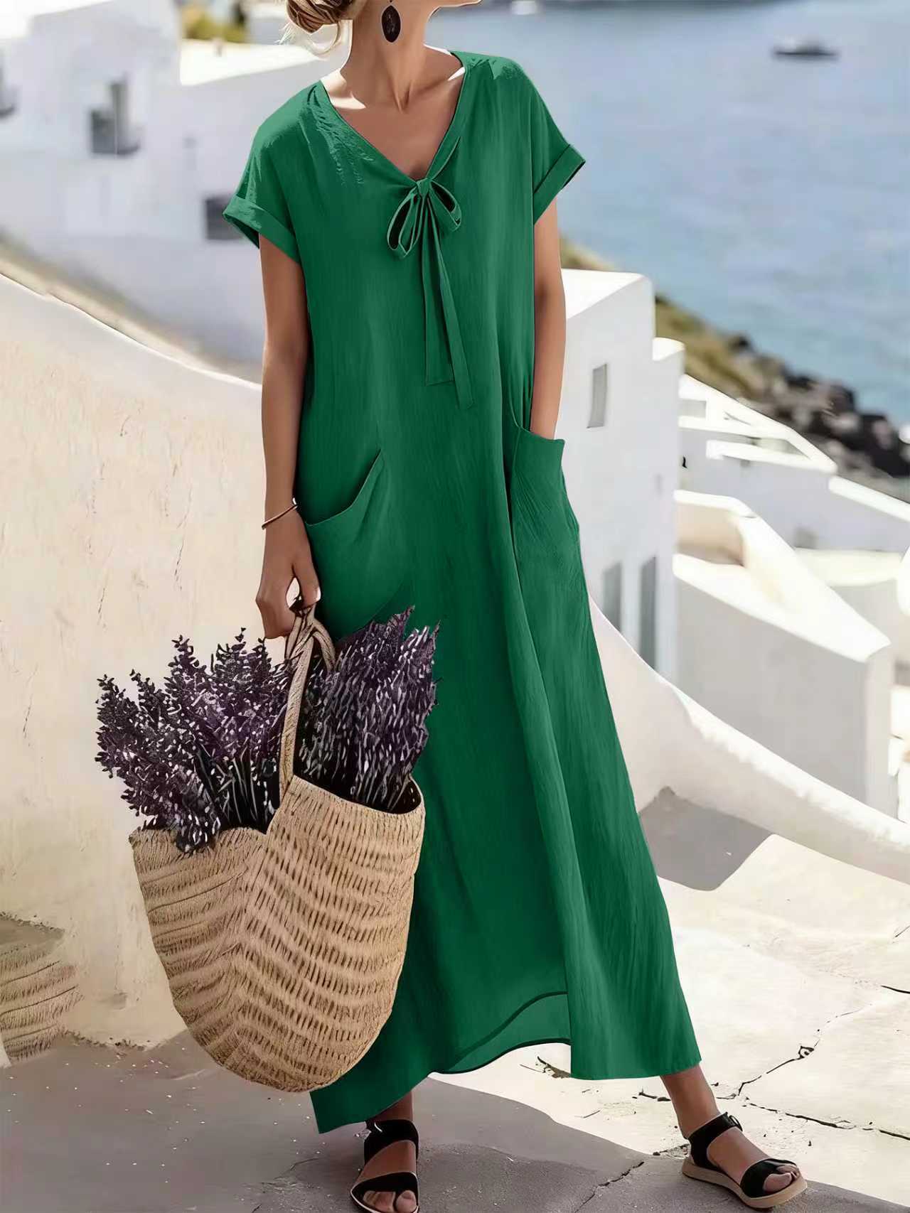 Casual V Neck Lace Up Solid Color Womens Dress