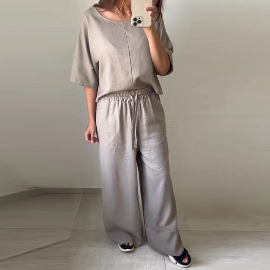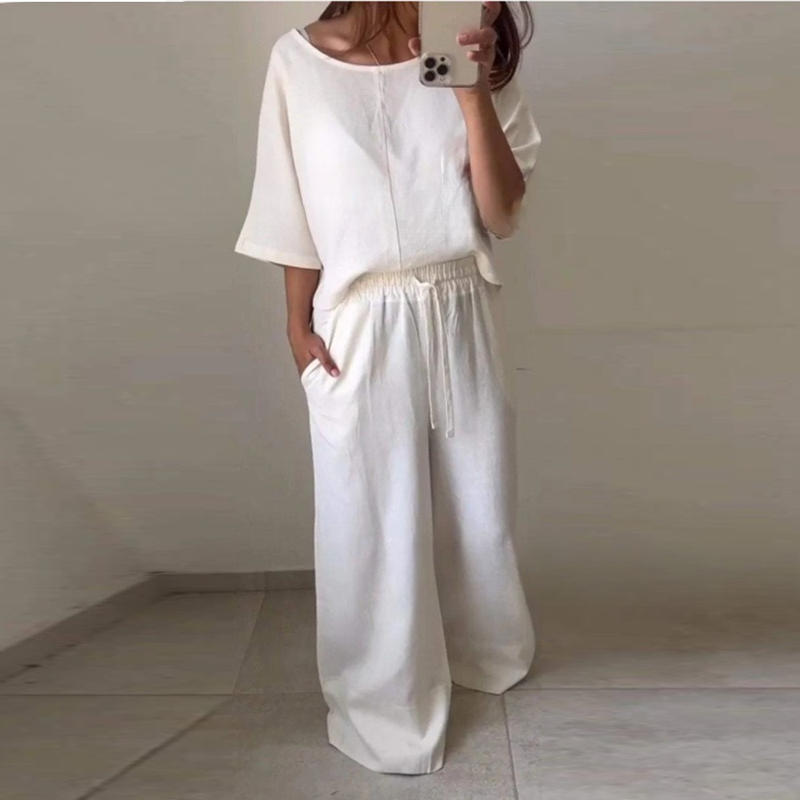 Casual Women's Round Neck Shirt With Half Sleeve Top Wide Leg Pants Suit