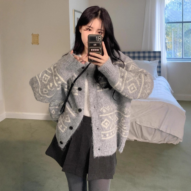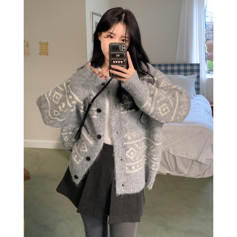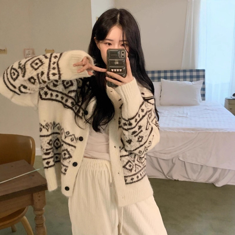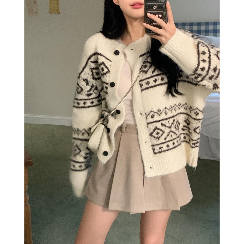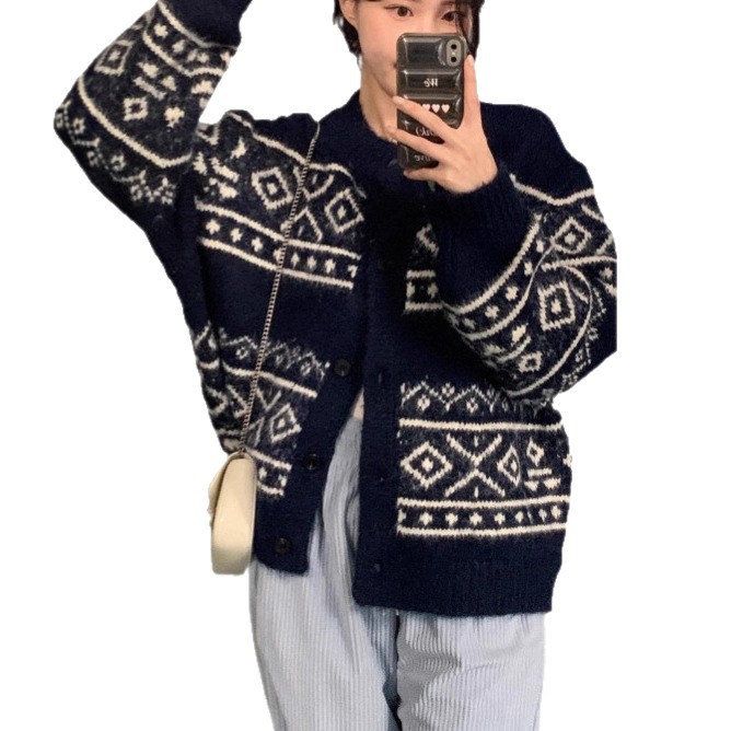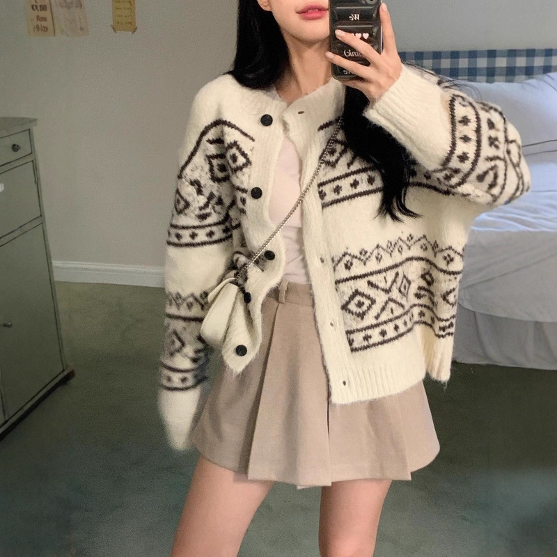 Casual Women's Sweater Geometric Pattern Round Neck Knitted Cardigan