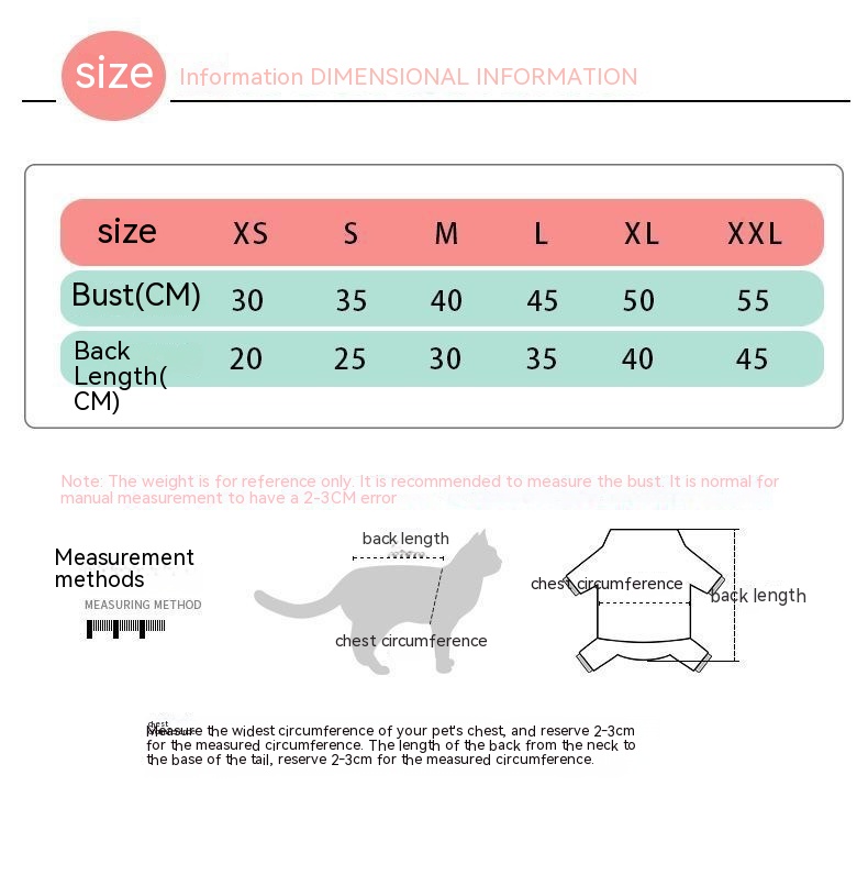 Size: XS-recommend standard 0.50 kg-1.00kg refers to chest and back length, S-recommend 1.50 kg-2.50kg,M-recommend kg-3. Less than 50kg, L-recommend 3.50-4. Less than 50kg