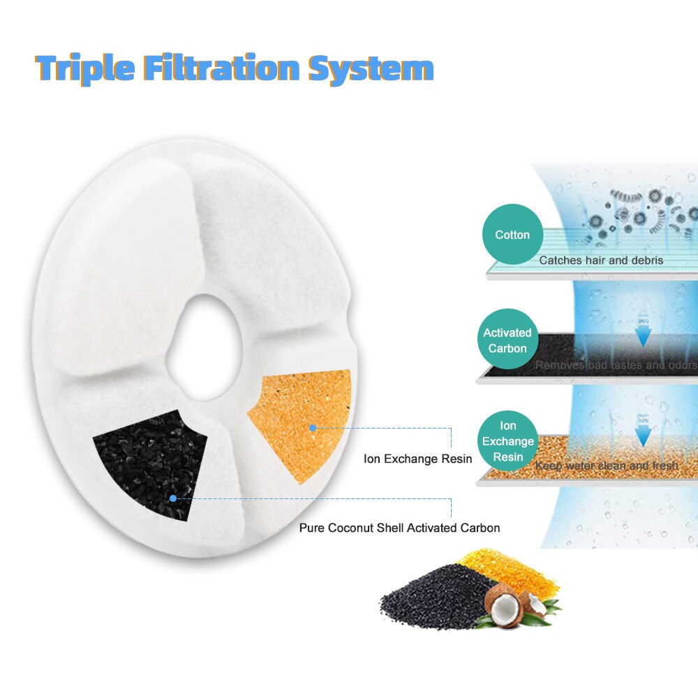 The water quality can be removed by three kinds of filtration methods. The outer cotton layer on each filter traps hair and debris. Three-stage filtration can ensure water quality and improve the cat's fresh water taste.